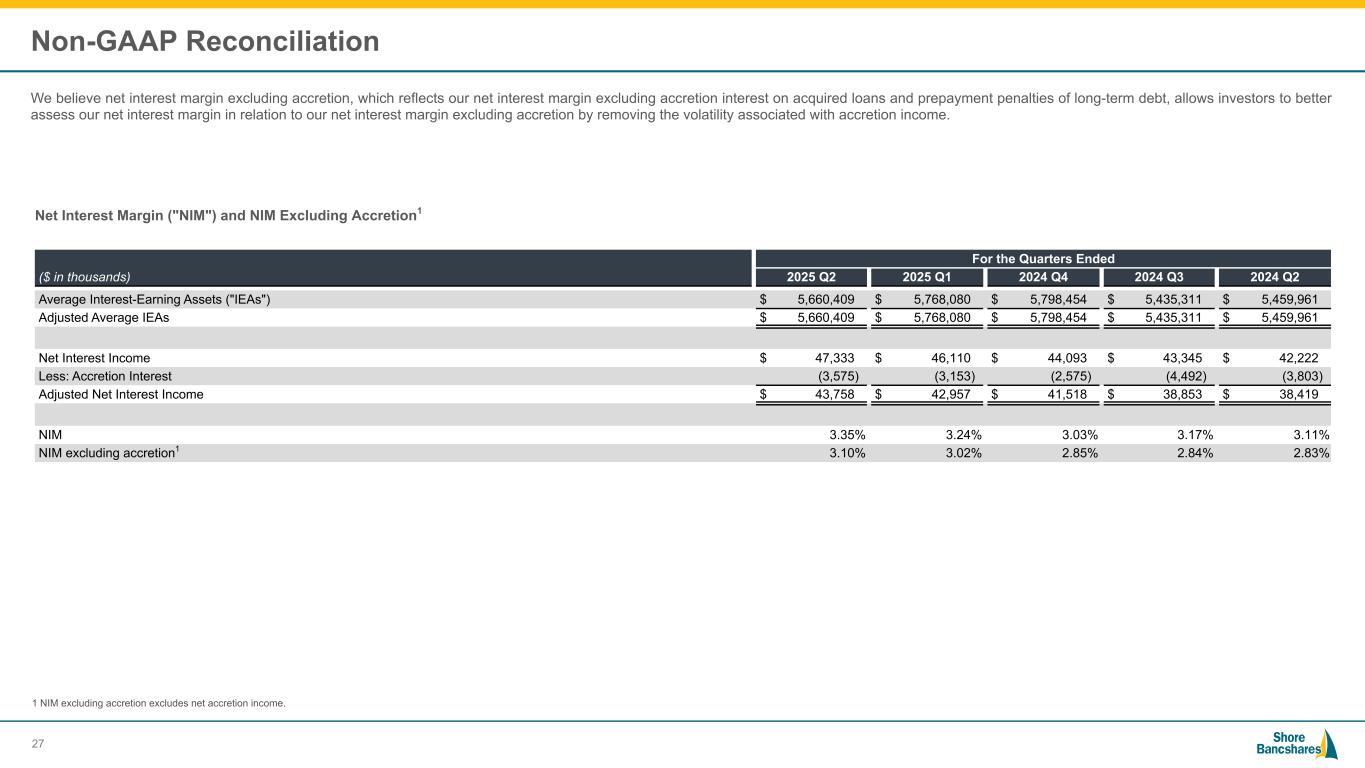 #006881 #ACC0C6 #83AFB4 #FEBE10 #5F574F #4D4F53 #C75B12 #5B8F22 #593160 Non-GAAP Reconciliation We believe net interest margin excluding accretion, which reflects our net interest margin excluding accretion interest on acquired loans and prepayment penalties of long-term debt, allows investors to better assess our net interest margin in relation to our net interest margin excluding accretion by removing the volatility associated with accretion income. Net Interest Margin ("NIM") and NIM Excluding Accretion1 ($ in thousands) For the Quarters Ended 2025 Q2 2025 Q1 2024 Q4 2024 Q3 2024 Q2 Average Interest-Earning Assets ("IEAs") $ 5,660,409 $ 5,768,080 $ 5,798,454 $ 5,435,311 $ 5,459,961 Adjusted Average IEAs $ 5,660,409 $ 5,768,080 $ 5,798,454 $ 5,435,311 $ 5,459,961 Net Interest Income $ 47,333 $ 46,110 $ 44,093 $ 43,345 $ 42,222 Less: Accretion Interest (3,575) (3,153) (2,575) (4,492) (3,803) Adjusted Net Interest Income $ 43,758 $ 42,957 $ 41,518 $ 38,853 $ 38,419 NIM 3.35 % 3.24 % 3.03 % 3.17 % 3.11 % NIM excluding accretion1 3.10 % 3.02 % 2.85 % 2.84 % 2.83 % 1 NIM excluding accretion excludes net accretion income. 27