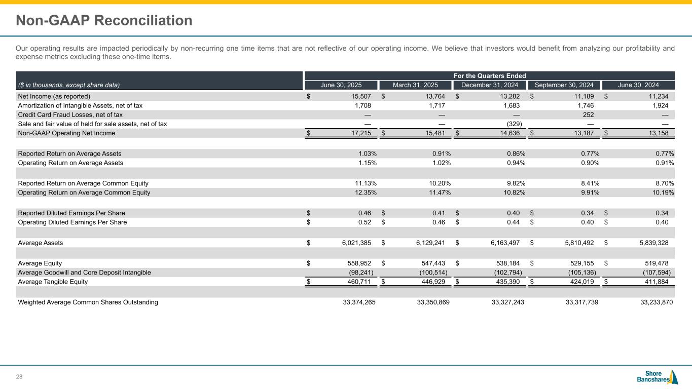 #006881 #ACC0C6 #83AFB4 #FEBE10 #5F574F #4D4F53 #C75B12 #5B8F22 #593160 Non-GAAP Reconciliation Our operating results are impacted periodically by non-recurring one time items that are not reflective of our operating income. We believe that investors would benefit from analyzing our profitability and expense metrics excluding these one-time items. ($ in thousands, except share data) For the Quarters Ended June 30, 2025 March 31, 2025 December 31, 2024 September 30, 2024 June 30, 2024 Net Income (as reported) $ 15,507 $ 13,764 $ 13,282 $ 11,189 $ 11,234 Amortization of Intangible Assets, net of tax 1,708 1,717 1,683 1,746 1,924 Credit Card Fraud Losses, net of tax — — — 252 — Sale and fair value of held for sale assets, net of tax — — (329) — — Non-GAAP Operating Net Income $ 17,215 $ 15,481 $ 14,636 $ 13,187 $ 13,158 Reported Return on Average Assets 1.03 % 0.91 % 0.86 % 0.77 % 0.77 % Operating Return on Average Assets 1.15 % 1.02 % 0.94 % 0.90 % 0.91 % Reported Return on Average Common Equity 11.13 % 10.20 % 9.82 % 8.41 % 8.70 % Operating Return on Average Common Equity 12.35 % 11.47 % 10.82 % 9.91 % 10.19 % Reported Diluted Earnings Per Share $ 0.46 $ 0.41 $ 0.40 $ 0.34 $ 0.34 Operating Diluted Earnings Per Share $ 0.52 $ 0.46 $ 0.44 $ 0.40 $ 0.40 Average Assets $ 6,021,385 $ 6,129,241 $ 6,163,497 $ 5,810,492 $ 5,839,328 Average Equity $ 558,952 $ 547,443 $ 538,184 $ 529,155 $ 519,478 Average Goodwill and Core Deposit Intangible (98,241) (100,514) (102,794) (105,136) (107,594) Average Tangible Equity $ 460,711 $ 446,929 $ 435,390 $ 424,019 $ 411,884 Weighted Average Common Shares Outstanding 33,374,265 33,350,869 33,327,243 33,317,739 33,233,870 28