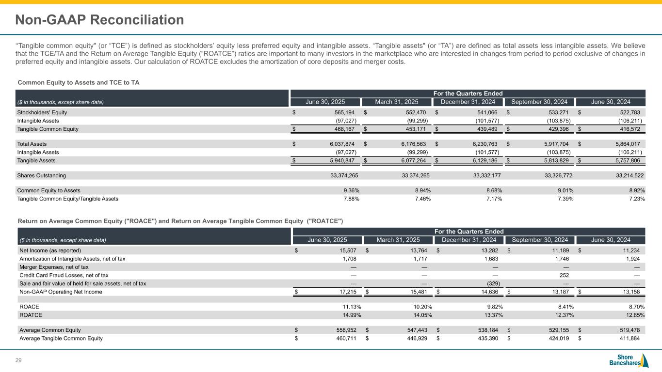 #006881 #ACC0C6 #83AFB4 #FEBE10 #5F574F #4D4F53 #C75B12 #5B8F22 #593160 Non-GAAP Reconciliation ‘‘Tangible common equity" (or “TCE”) is defined as stockholders’ equity less preferred equity and intangible assets. “Tangible assets" (or “TA”) are defined as total assets less intangible assets. We believe that the TCE/TA and the Return on Average Tangible Equity (“ROATCE”) ratios are important to many investors in the marketplace who are interested in changes from period to period exclusive of changes in preferred equity and intangible assets. Our calculation of ROATCE excludes the amortization of core deposits and merger costs. Common Equity to Assets and TCE to TA Return on Average Common Equity ("ROACE") and Return on Average Tangible Common Equity ("ROATCE") ($ in thousands, except share data) For the Quarters Ended June 30, 2025 March 31, 2025 December 31, 2024 September 30, 2024 June 30, 2024 Stockholders' Equity $ 565,194 $ 552,470 $ 541,066 $ 533,271 $ 522,783 Intangible Assets (97,027) (99,299) (101,577) (103,875) (106,211) Tangible Common Equity $ 468,167 $ 453,171 $ 439,489 $ 429,396 $ 416,572 Total Assets $ 6,037,874 $ 6,176,563 $ 6,230,763 $ 5,917,704 $ 5,864,017 Intangible Assets (97,027) (99,299) (101,577) (103,875) (106,211) Tangible Assets $ 5,940,847 $ 6,077,264 $ 6,129,186 $ 5,813,829 $ 5,757,806 Shares Outstanding 33,374,265 33,374,265 33,332,177 33,326,772 33,214,522 Common Equity to Assets 9.36 % 8.94 % 8.68 % 9.01 % 8.92 % Tangible Common Equity/Tangible Assets 7.88 % 7.46 % 7.17 % 7.39 % 7.23 % ($ in thousands, except share data) For the Quarters Ended June 30, 2025 March 31, 2025 December 31, 2024 September 30, 2024 June 30, 2024 Net Income (as reported) $ 15,507 $ 13,764 $ 13,282 $ 11,189 $ 11,234 Amortization of Intangible Assets, net of tax 1,708 1,717 1,683 1,746 1,924 Merger Expenses, net of tax — — — — — Credit Card Fraud Losses, net of tax — — — 252 — Sale and fair value of held for sale assets, net of tax — — (329) — — Non-GAAP Operating Net Income $ 17,215 $ 15,481 $ 14,636 $ 13,187 $ 13,158 ROACE 11.13 % 10.20 % 9.82 % 8.41 % 8.70 % ROATCE 14.99 % 14.05 % 13.37 % 12.37 % 12.85 % Average Common Equity $ 558,952 $ 547,443 $ 538,184 $ 529,155 $ 519,478 Average Tangible Common Equity $ 460,711 $ 446,929 $ 435,390 $ 424,019 $ 411,884 29