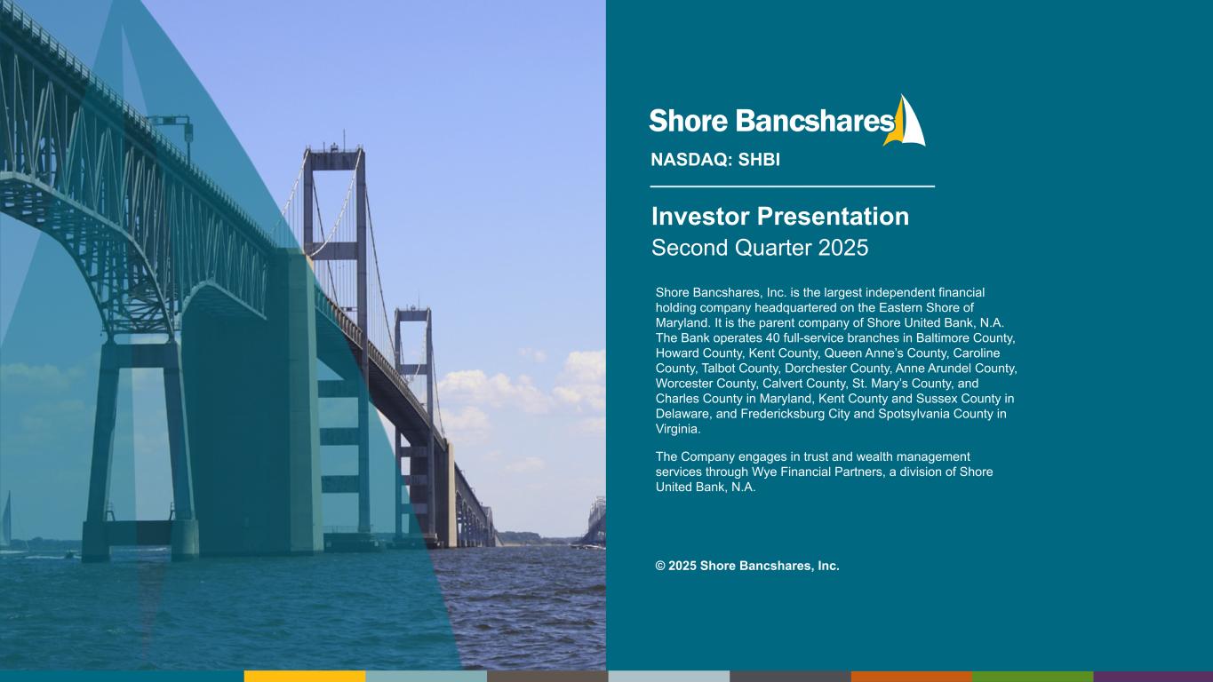 #006881 #ACC0C6 #83AFB4 #FEBE10 #5F574F #4D4F53 #C75B12 #5B8F22 #593160 Investor Presentation Second Quarter 2025 NASDAQ: SHBI Shore Bancshares, Inc. is the largest independent financial holding company headquartered on the Eastern Shore of Maryland. It is the parent company of Shore United Bank, N.A. The Bank operates 40 full-service branches in Baltimore County, Howard County, Kent County, Queen Anne’s County, Caroline County, Talbot County, Dorchester County, Anne Arundel County, Worcester County, Calvert County, St. Mary’s County, and Charles County in Maryland, Kent County and Sussex County in Delaware, and Fredericksburg City and Spotsylvania County in Virginia. The Company engages in trust and wealth management services through Wye Financial Partners, a division of Shore United Bank, N.A. © 2025 Shore Bancshares, Inc.