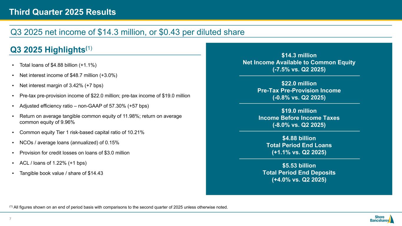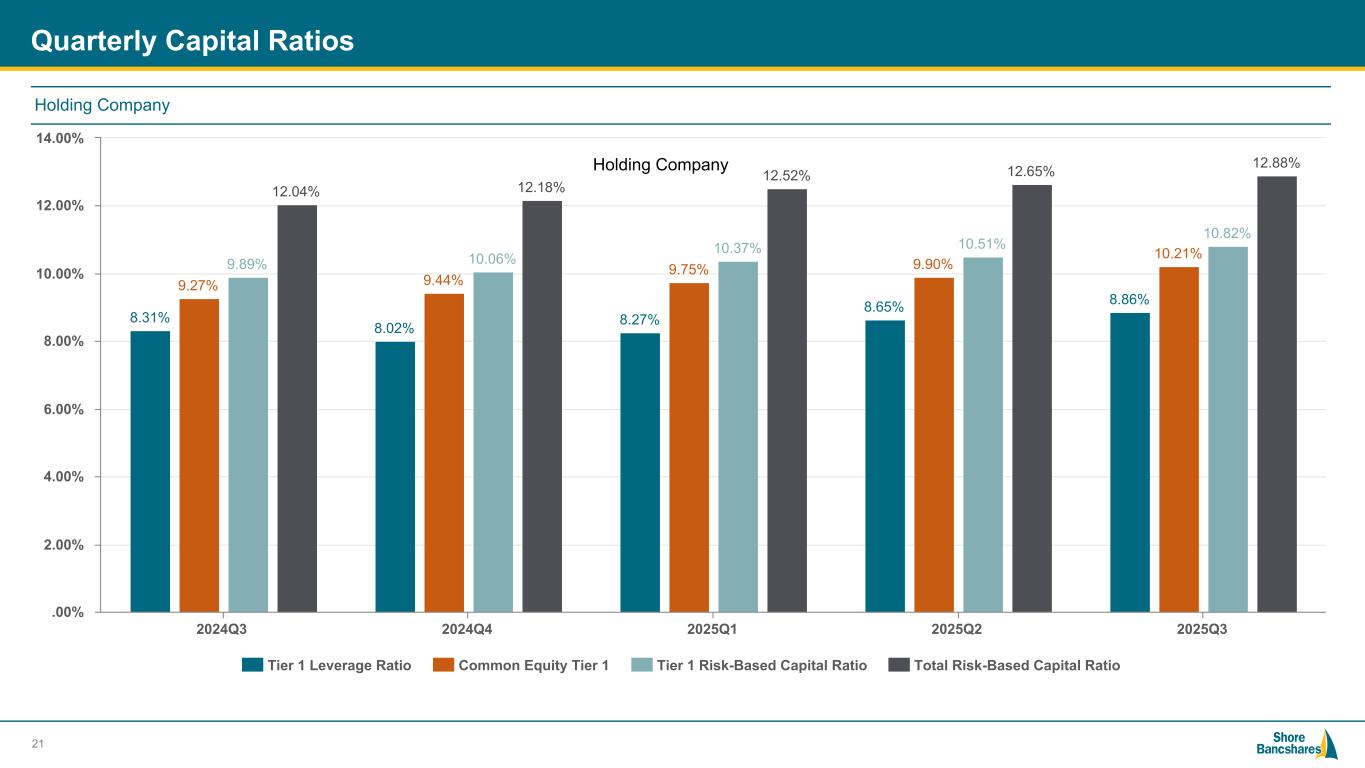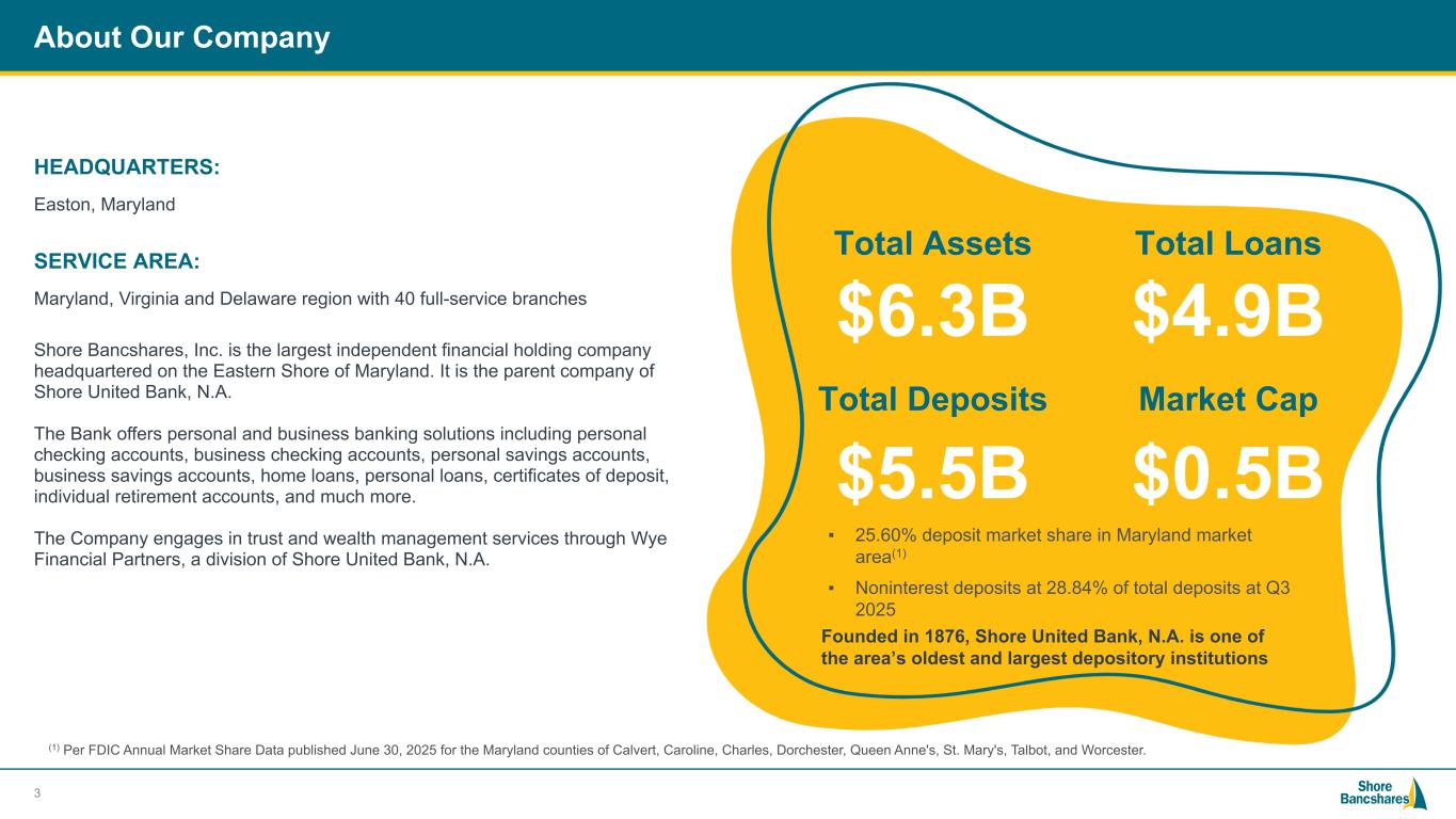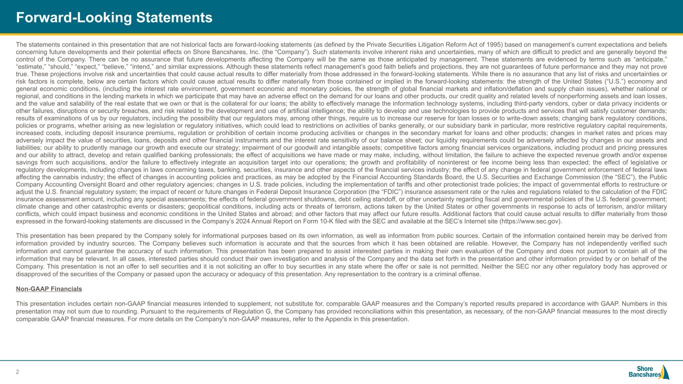 #006881 #ACC0C6 #83AFB4 #FEBE10 #5F574F #4D4F53 #C75B12 #5B8F22 #593160 Forward-Looking Statements The statements contained in this presentation that are not historical facts are forward-looking statements (as defined by the Private Securities Litigation Reform Act of 1995) based on management’s current expectations and beliefs concerning future developments and their potential effects on Shore Bancshares, Inc. (the “Company”). Such statements involve inherent risks and uncertainties, many of which are difficult to predict and are generally beyond the control of the Company. There can be no assurance that future developments affecting the Company will be the same as those anticipated by management. These statements are evidenced by terms such as “anticipate,” “estimate,” “should,” “expect,” “believe,” “intend,” and similar expressions. Although these statements reflect management’s good faith beliefs and projections, they are not guarantees of future performance and they may not prove true. These projections involve risk and uncertainties that could cause actual results to differ materially from those addressed in the forward-looking statements. While there is no assurance that any list of risks and uncertainties or risk factors is complete, below are certain factors which could cause actual results to differ materially from those contained or implied in the forward-looking statements: the strength of the United States (“U.S.”) economy and general economic conditions, (including the interest rate environment, government economic and monetary policies, the strength of global financial markets and inflation/deflation and supply chain issues), whether national or regional, and conditions in the lending markets in which we participate that may have an adverse effect on the demand for our loans and other products, our credit quality and related levels of nonperforming assets and loan losses, and the value and salability of the real estate that we own or that is the collateral for our loans; the ability to effectively manage the information technology systems, including third-party vendors, cyber or data privacy incidents or other failures, disruptions or security breaches, and risk related to the development and use of artificial intelligence; the ability to develop and use technologies to provide products and services that will satisfy customer demands; results of examinations of us by our regulators, including the possibility that our regulators may, among other things, require us to increase our reserve for loan losses or to write-down assets; changing bank regulatory conditions, policies or programs, whether arising as new legislation or regulatory initiatives, which could lead to restrictions on activities of banks generally, or our subsidiary bank in particular, more restrictive regulatory capital requirements, increased costs, including deposit insurance premiums, regulation or prohibition of certain income producing activities or changes in the secondary market for loans and other products; changes in market rates and prices may adversely impact the value of securities, loans, deposits and other financial instruments and the interest rate sensitivity of our balance sheet; our liquidity requirements could be adversely affected by changes in our assets and liabilities; our ability to prudently manage our growth and execute our strategy; impairment of our goodwill and intangible assets; competitive factors among financial services organizations, including product and pricing pressures and our ability to attract, develop and retain qualified banking professionals; the effect of acquisitions we have made or may make, including, without limitation, the failure to achieve the expected revenue growth and/or expense savings from such acquisitions, and/or the failure to effectively integrate an acquisition target into our operations; the growth and profitability of noninterest or fee income being less than expected; the effect of legislative or regulatory developments, including changes in laws concerning taxes, banking, securities, insurance and other aspects of the financial services industry; the effect of any change in federal government enforcement of federal laws affecting the cannabis industry; the effect of changes in accounting policies and practices, as may be adopted by the Financial Accounting Standards Board, the U.S. Securities and Exchange Commission (the “SEC”), the Public Company Accounting Oversight Board and other regulatory agencies; changes in U.S. trade policies, including the implementation of tariffs and other protectionist trade policies; the impact of governmental efforts to restructure or adjust the U.S. financial regulatory system; the impact of recent or future changes in Federal Deposit Insurance Corporation (the “FDIC”) insurance assessment rate or the rules and regulations related to the calculation of the FDIC insurance assessment amount, including any special assessments; the effects of federal government shutdowns, debt ceiling standoff, or other uncertainty regarding fiscal and governmental policies of the U.S. federal government; climate change and other catastrophic events or disasters; geopolitical conditions, including acts or threats of terrorism, actions taken by the United States or other governments in response to acts of terrorism, and/or military conflicts, which could impact business and economic conditions in the United States and abroad; and other factors that may affect our future results. Additional factors that could cause actual results to differ materially from those expressed in the forward-looking statements are discussed in the Company’s 2024 Annual Report on Form 10-K filed with the SEC and available at the SEC’s Internet site (https://www.sec.gov). This presentation has been prepared by the Company solely for informational purposes based on its own information, as well as information from 