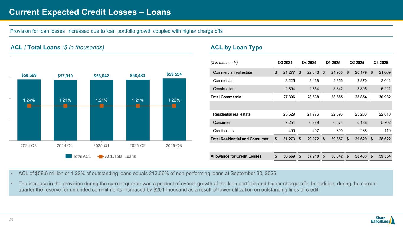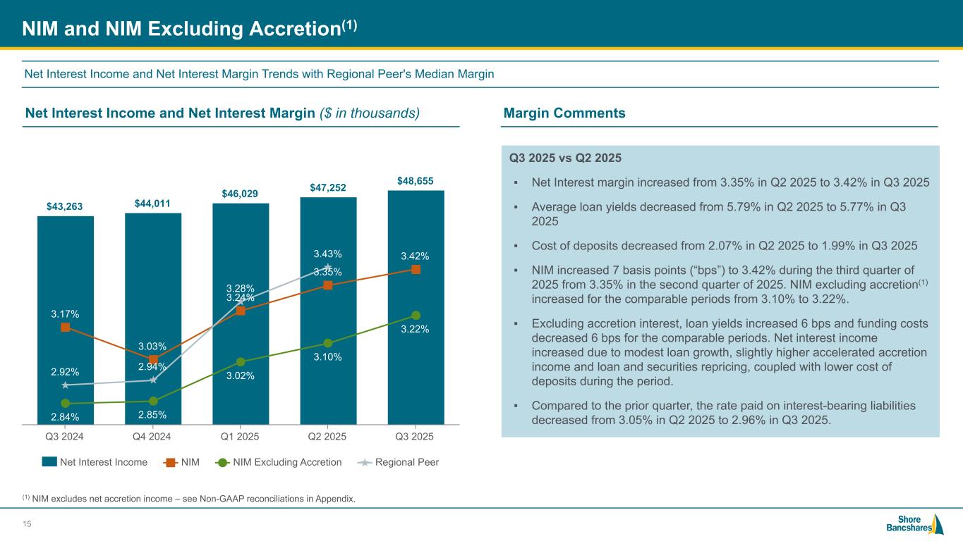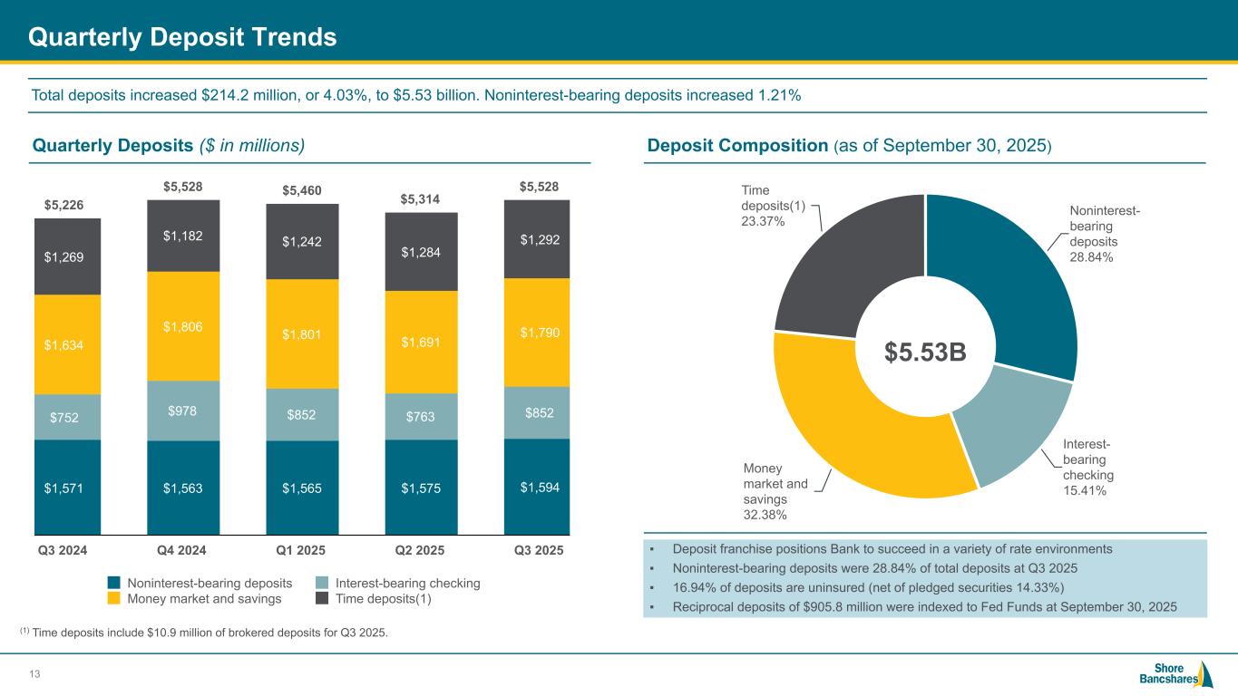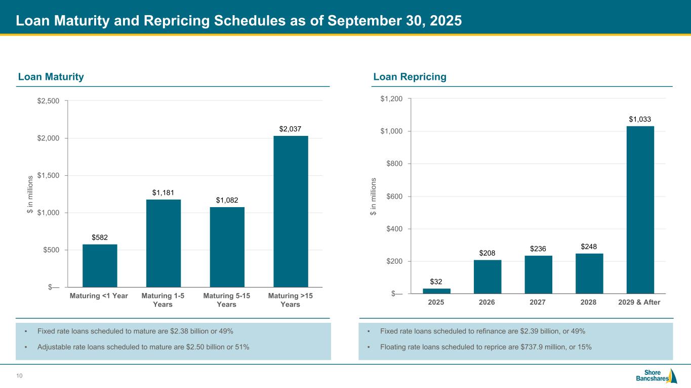 #006881 #ACC0C6 #83AFB4 #FEBE10 #5F574F #4D4F53 #C75B12 #5B8F22 #593160 Forward-Looking Statements The statements contained in this presentation that are not historical facts are forward-looking statements (as defined by the Private Securities Litigation Reform Act of 1995) based on management’s current expectations and beliefs concerning future developments and their potential effects on Shore Bancshares, Inc. (the “Company”). Such statements involve inherent risks and uncertainties, many of which are difficult to predict and are generally beyond the control of the Company. There can be no assurance that future developments affecting the Company will be the same as those anticipated by management. These statements are evidenced by terms such as “anticipate,” “estimate,” “should,” “expect,” “believe,” “intend,” and similar expressions. Although these statements reflect management’s good faith beliefs and projections, they are not guarantees of future performance and they may not prove true. These projections involve risk and uncertainties that could cause actual results to differ materially from those addressed in the forward-looking statements. While there is no assurance that any list of risks and uncertainties or risk factors is complete, below are certain factors which could cause actual results to differ materially from those contained or implied in the forward-looking statements: the strength of the United States (“U.S.”) economy and general economic conditions, (including the interest rate environment, government economic and monetary policies, the strength of global financial markets and inflation/deflation and supply chain issues), whether national or regional, and conditions in the lending markets in which we participate that may have an adverse effect on the demand for our loans and other products, our credit quality and related levels of nonperforming assets and loan losses, and the value and salability of the real estate that we own or that is the collateral for our loans; the ability to effectively manage the information technology systems, including third-party vendors, cyber or data privacy incidents or other failures, disruptions or security breaches, and risk related to the development and use of artificial intelligence; the ability to develop and use technologies to provide products and services that will satisfy customer demands; results of examinations of us by our regulators, including the possibility that our regulators may, among other things, require us to increase our reserve for loan losses or to write-down assets; changing bank regulatory conditions, policies or programs, whether arising as new legislation or regulatory initiatives, which could lead to restrictions on activities of banks generally, or our subsidiary bank in particular, more restrictive regulatory capital requirements, increased costs, including deposit insurance premiums, regulation or prohibition of certain income producing activities or changes in the secondary market for loans and other products; changes in market rates and prices may adversely impact the value of securities, loans, deposits and other financial instruments and the interest rate sensitivity of our balance sheet; our liquidity requirements could be adversely affected by changes in our assets and liabilities; our ability to prudently manage our growth and execute our strategy; impairment of our goodwill and intangible assets; competitive factors among financial services organizations, including product and pricing pressures and our ability to attract, develop and retain qualified banking professionals; the effect of acquisitions we have made or may make, including, without limitation, the failure to achieve the expected revenue growth and/or expense savings from such acquisitions, and/or the failure to effectively integrate an acquisition target into our operations; the growth and profitability of noninterest or fee income being less than expected; the effect of legislative or regulatory developments, including changes in laws concerning taxes, banking, securities, insurance and other aspects of the financial services industry; the effect of any change in federal government enforcement of federal laws affecting the cannabis industry; the effect of changes in accounting policies and practices, as may be adopted by the Financial Accounting Standards Board, the U.S. Securities and Exchange Commission (the “SEC”), the Public Company Accounting Oversight Board and other regulatory agencies; changes in U.S. trade policies, including the implementation of tariffs and other protectionist trade policies; the impact of governmental efforts to restructure or adjust the U.S. financial regulatory system; the impact of recent or future changes in Federal Deposit Insurance Corporation (the “FDIC”) insurance assessment rate or the rules and regulations related to the calculation of the FDIC insurance assessment amount, including any special assessments; the effects of federal government shutdowns, debt ceiling standoff, or other uncertainty regarding fiscal and governmental policies of the U.S. federal government; climate change and other catastrophic events or disasters; geopolitical conditions, including acts or threats of terrorism, actions taken by the United States or other governments in response to acts of terrorism, and/or military conflicts, which could impact business and economic conditions in the United States and abroad; and other factors that may affect our future results. Additional factors that could cause actual results to differ materially from those expressed in the forward-looking statements are discussed in the Company’s 2024 Annual Report on Form 10-K filed with the SEC and available at the SEC’s Internet site (https://www.sec.gov). This presentation has been prepared by the Company solely for informational purposes based on its own information, as well as information from 