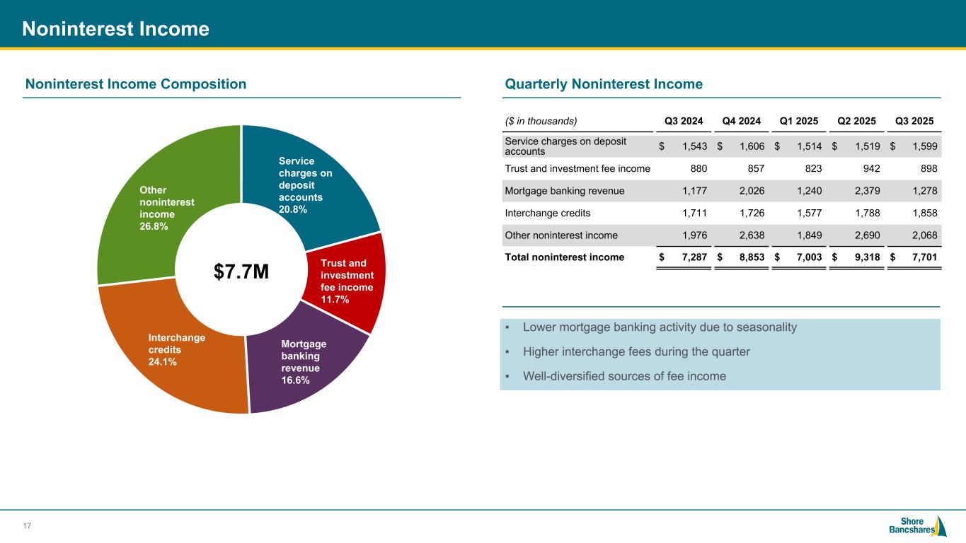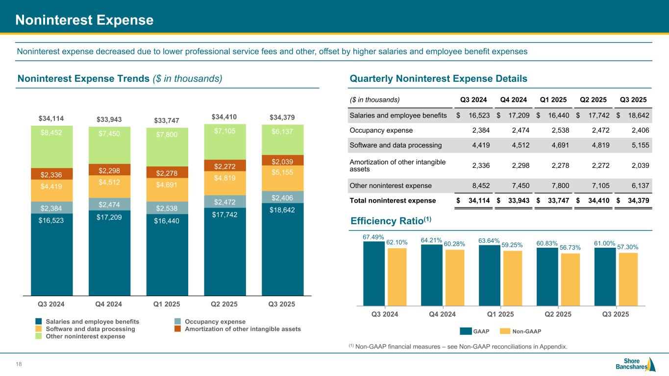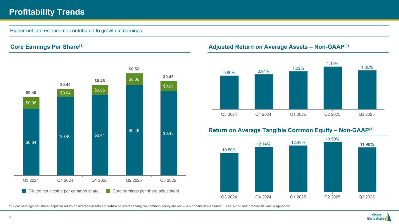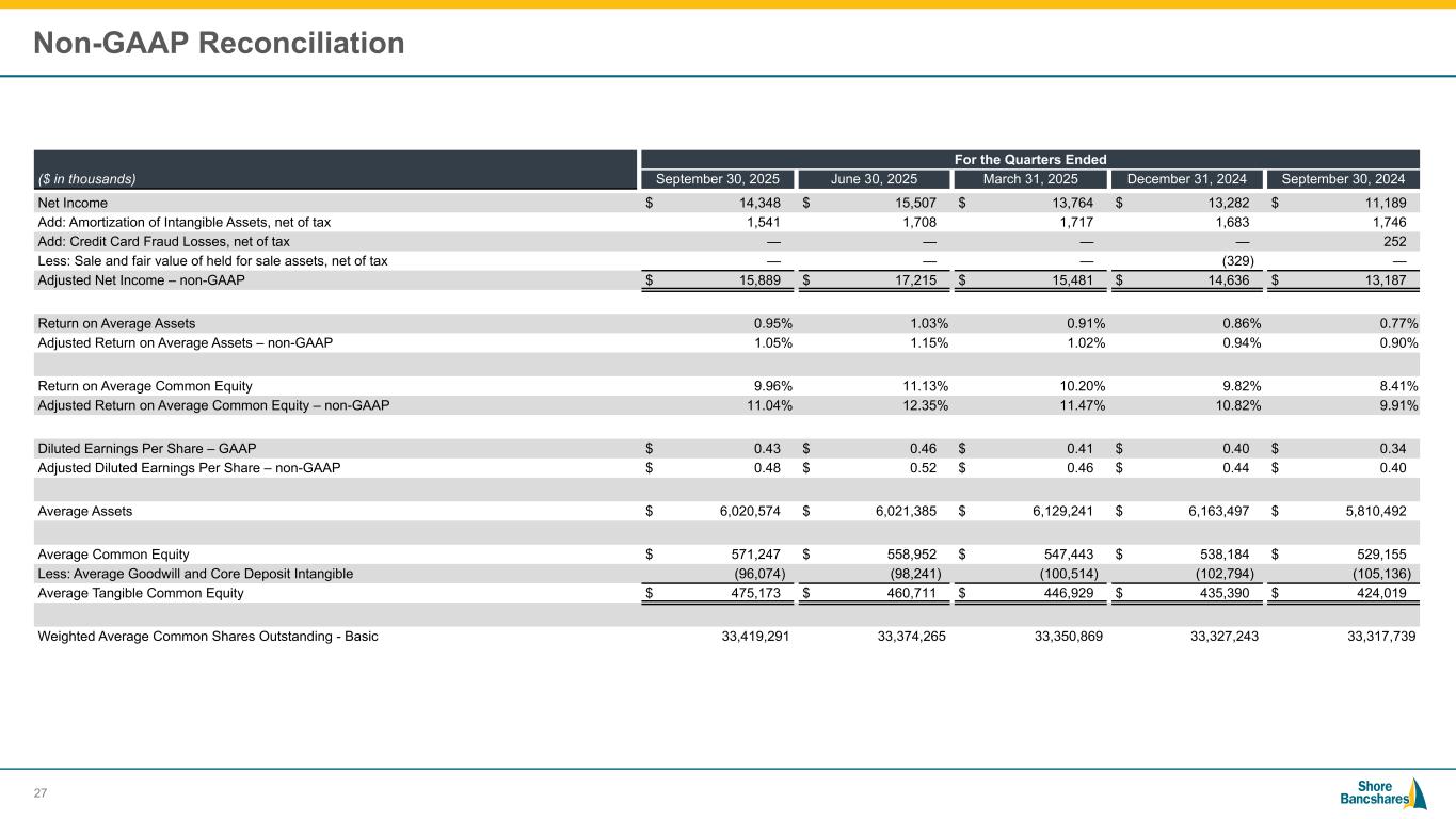 #006881 #ACC0C6 #83AFB4 #FEBE10 #5F574F #4D4F53 #C75B12 #5B8F22 #593160 Non-GAAP Reconciliation ($ in thousands) For the Quarters Ended September 30, 2025 June 30, 2025 March 31, 2025 December 31, 2024 September 30, 2024 Net Income $ 14,348 $ 15,507 $ 13,764 $ 13,282 $ 11,189 Add: Amortization of Intangible Assets, net of tax 1,541 1,708 1,717 1,683 1,746 Add: Credit Card Fraud Losses, net of tax — — — — 252 Less: Sale and fair value of held for sale assets, net of tax — — — (329) — Adjusted Net Income – non-GAAP $ 15,889 $ 17,215 $ 15,481 $ 14,636 $ 13,187 Return on Average Assets 0.95 % 1.03 % 0.91 % 0.86 % 0.77 % Adjusted Return on Average Assets – non-GAAP 1.05 % 1.15 % 1.02 % 0.94 % 0.90 % Return on Average Common Equity 9.96 % 11.13 % 10.20 % 9.82 % 8.41 % Adjusted Return on Average Common Equity – non-GAAP 11.04 % 12.35 % 11.47 % 10.82 % 9.91 % Diluted Earnings Per Share – GAAP $ 0.43 $ 0.46 $ 0.41 $ 0.40 $ 0.34 Adjusted Diluted Earnings Per Share – non-GAAP $ 0.48 $ 0.52 $ 0.46 $ 0.44 $ 0.40 Average Assets $ 6,020,574 $ 6,021,385 $ 6,129,241 $ 6,163,497 $ 5,810,492 Average Common Equity $ 571,247 $ 558,952 $ 547,443 $ 538,184 $ 529,155 Less: Average Goodwill and Core Deposit Intangible (96,074) (98,241) (100,514) (102,794) (105,136) Average Tangible Common Equity $ 475,173 $ 460,711 $ 446,929 $ 435,390 $ 424,019 Weighted Average Common Shares Outstanding - Basic 33,419,291 33,374,265 33,350,869 33,327,243 33,317,739 27