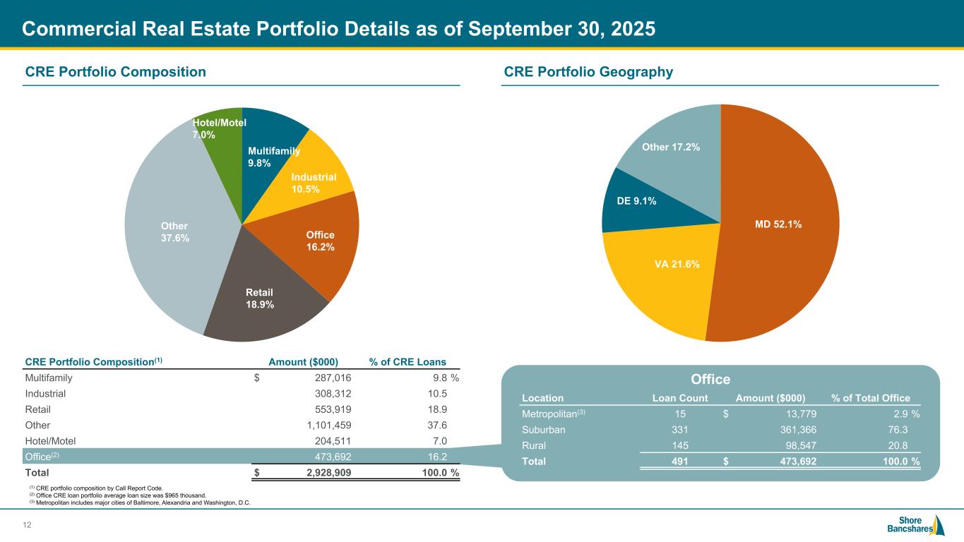 #006881 #ACC0C6 #83AFB4 #FEBE10 #5F574F #4D4F53 #C75B12 #5B8F22 #593160 Commercial Real Estate Portfolio Details as of September 30, 2025 Total CRE Portfolio $2.93B Total average CRE loan size(1) $1.11M % with guaranty (by $ / by #) 83% / 90% Past due 30-89 days $4.59 million / 0.16% of total CRE Nonaccrual $5.66 million / 0.19% of total CRE Special mention $52.87 million / 1.81% of total CRE Classified $25.58 million / 0.87% of total CRE ▪ Office CRE loans comprise 16.20% of total CRE loans and 9.70% of our total loan portfolio ▪ CRE portfolio is 26.39% owner occupied, 52.57% non-owner occupied, 11.98% construction and 9.06% multifamily ▪ 73.90% of CRE loans are below $1 million dollars 11 CRE Portfolio Metrics Number of Loans by Balance 1,953 586 64 36 3 1 <$1mm $1-5mm $5-10mm $10-20mm $20-30mm >$30mm 0 500 1,000 1,500 2,000 2,500 (1) Overall loan portfolio average loan size is $270k