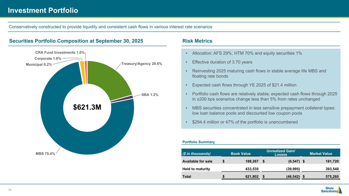 #006881 #ACC0C6 #83AFB4 #FEBE10 #5F574F #4D4F53 #C75B12 #5B8F22 #593160 Quarterly Deposit Trends 13 $5,226 $5,528 $5,460 $5,314 $5,528 $1,571 $1,563 $1,565 $1,575 $1,594 $752 $978 $852 $763 $852 $1,634 $1,806 $1,801 $1,691 $1,790 $1,269 $1,182 $1,242 $1,284 $1,292 Noninterest-bearing deposits Interest-bearing checking Money market and savings Time deposits(1) Q3 2024 Q4 2024 Q1 2025 Q2 2025 Q3 2025 Noninterest- bearing deposits 28.84% Interest- bearing checking 15.41% Money market and savings 32.38% Time deposits(1) 23.37% Quarterly Deposits ($ in millions) Deposit Composition (as of September 30, 2025) Total deposits increased $214.2 million, or 4.03%, to $5.53 billion. Noninterest-bearing deposits increased 1.21% $5.53B ▪ Deposit franchise positions Bank to succeed in a variety of rate environments ▪ Noninterest-bearing deposits were 28.84% of total deposits at Q3 2025 ▪ 16.94% of deposits are uninsured (net of pledged securities 14.33%) ▪ Reciprocal deposits of $905.8 million were indexed to Fed Funds at September 30, 2025 (1) Time deposits include $10.9 million of brokered deposits for Q3 2025.