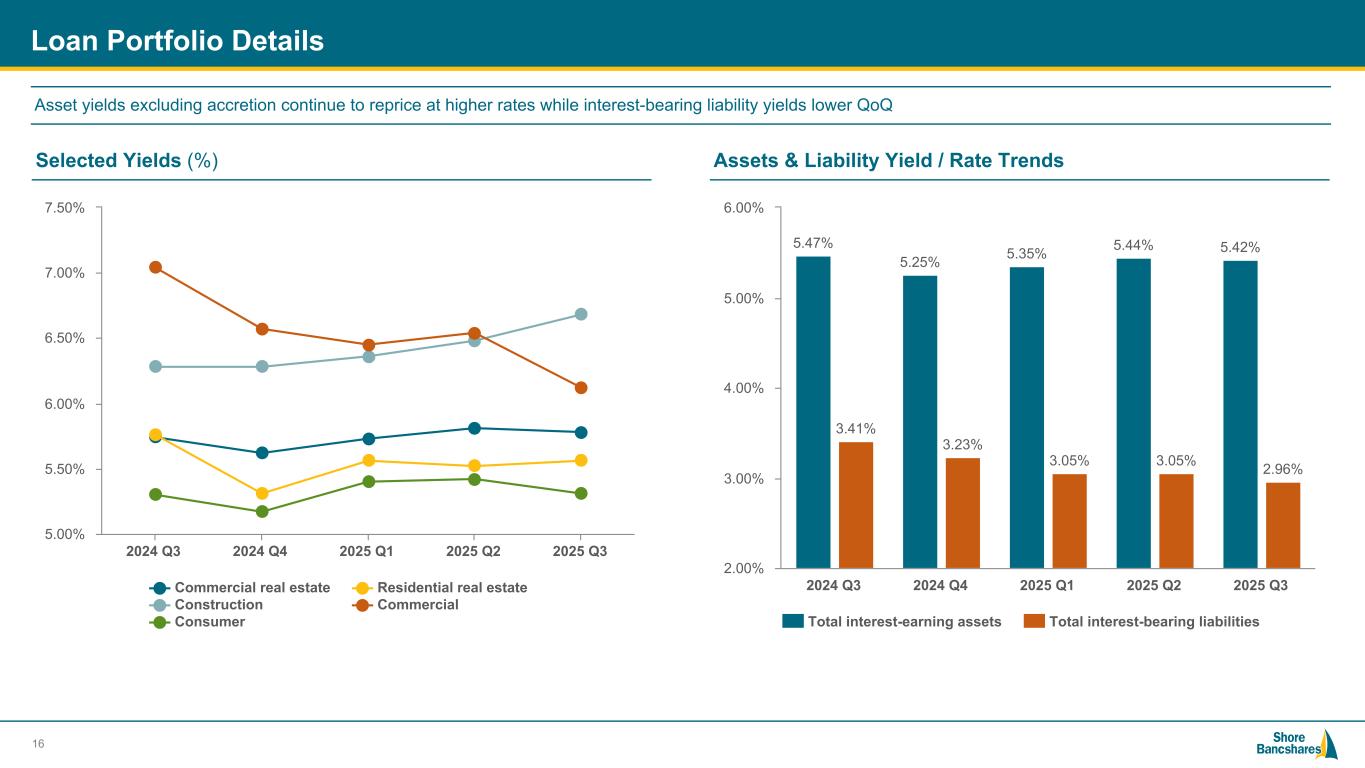 #006881 #ACC0C6 #83AFB4 #FEBE10 #5F574F #4D4F53 #C75B12 #5B8F22 #593160 $43,263 $44,011 $46,029 $47,252 $48,655 3.17% 3.03% 3.24% 3.35% 3.42% 2.84% 2.85% 3.02% 3.10% 3.22% 2.92% 2.94% 3.28% 3.43% Net Interest Income NIM NIM Excluding Accretion Regional Peer Q3 2024 Q4 2024 Q1 2025 Q2 2025 Q3 2025 NIM and NIM Excluding Accretion(1) (1) NIM excludes net accretion income – see Non-GAAP reconciliations in Appendix. 15 Net Interest Income and Net Interest Margin ($ in thousands) Margin Comments Net Interest Income and Net Interest Margin Trends with Regional Peer's Median Margin Q3 2025 vs Q2 2025 ▪ Net Interest margin increased from 3.35% in Q2 2025 to 3.42% in Q3 2025 ▪ Average loan yields decreased from 5.79% in Q2 2025 to 5.77% in Q3 2025 ▪ Cost of deposits decreased from 2.07% in Q2 2025 to 1.99% in Q3 2025 ▪ NIM increased 7 basis points (“bps”) to 3.42% during the third quarter of 2025 from 3.35% in the second quarter of 2025. NIM excluding accretion(1) increased for the comparable periods from 3.10% to 3.22%. ▪ Excluding accretion interest, loan yields increased 6 bps and funding costs decreased 6 bps for the comparable periods. Net interest income increased due to modest loan growth, slightly higher accelerated accretion income and loan and securities repricing, coupled with lower cost of deposits during the period. ▪ Compared to the prior quarter, the rate paid on interest-bearing liabilities decreased from 3.05% in Q2 2025 to 2.96% in Q3 2025.
