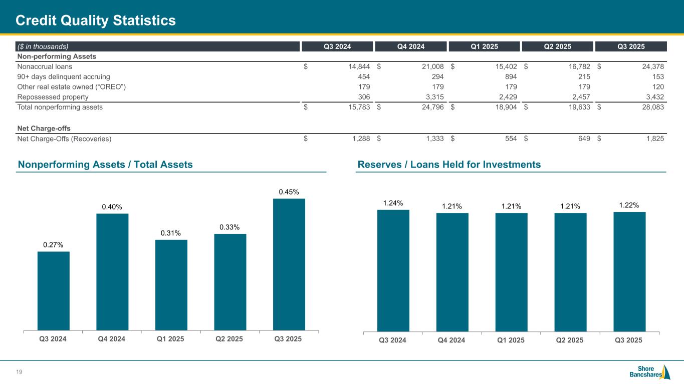 #006881 #ACC0C6 #83AFB4 #FEBE10 #5F574F #4D4F53 #C75B12 #5B8F22 #593160 Noninterest Expense 18 Noninterest Expense Trends ($ in thousands) Quarterly Noninterest Expense Details Noninterest expense decreased due to lower professional service fees and other, offset by higher salaries and employee benefit expenses ($ in thousands) Q3 2024 Q4 2024 Q1 2025 Q2 2025 Q3 2025 Salaries and employee benefits $ 16,523 $ 17,209 $ 16,440 $ 17,742 $ 18,642 Occupancy expense 2,384 2,474 2,538 2,472 2,406 Software and data processing 4,419 4,512 4,691 4,819 5,155 Amortization of other intangible assets 2,336 2,298 2,278 2,272 2,039 Other noninterest expense 8,452 7,450 7,800 7,105 6,137 Total noninterest expense $ 34,114 $ 33,943 $ 33,747 $ 34,410 $ 34,379 Efficiency Ratio(1) $34,114 $33,943 $33,747 $34,410 $34,379 $16,523 $17,209 $16,440 $17,742 $18,642$2,384 $2,474 $2,538 $2,472 $2,406 $4,419 $4,512 $4,691 $4,819 $5,155$2,336 $2,298 $2,278 $2,272 $2,039 $8,452 $7,450 $7,800 $7,105 $6,137 Salaries and employee benefits Occupancy expense Software and data processing Amortization of other intangible assets Other noninterest expense Q3 2024 Q4 2024 Q1 2025 Q2 2025 Q3 2025 67.49% 64.21% 63.64% 60.83% 61.00%62.10% 60.28% 59.25% 56.73% 57.30% GAAP Non-GAAP Q3 2024 Q4 2024 Q1 2025 Q2 2025 Q3 2025 (1) Non-GAAP financial measures – see Non-GAAP reconciliations in Appendix.