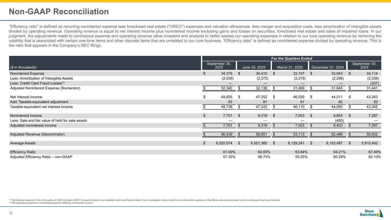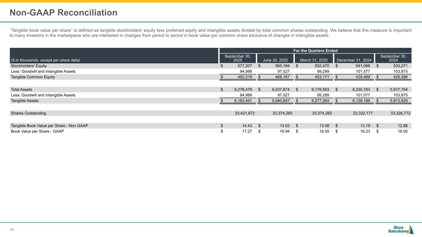 #006881 #ACC0C6 #83AFB4 #FEBE10 #5F574F #4D4F53 #C75B12 #5B8F22 #593160 Non-GAAP Reconciliation ‘‘Tangible book value per share’’ is defined as tangible stockholders’ equity less preferred equity and intangible assets divided by total common shares outstanding. We believe that this measure is important to many investors in the marketplace who are interested in changes from period to period in book value per common share exclusive of changes in intangible assets. ($ in thousands, except per share data) For the Quarters Ended September 30, 2025 June 30, 2025 March 31, 2025 December 31, 2024 September 30, 2024 Stockholders' Equity $ 577,207 $ 565,194 $ 552,470 $ 541,066 $ 533,271 Less: Goodwill and Intangible Assets 94,988 97,027 99,299 101,577 103,875 Tangible Common Equity $ 482,219 $ 468,167 $ 453,171 $ 439,489 $ 429,396 Total Assets $ 6,278,479 $ 6,037,874 $ 6,176,563 $ 6,230,763 $ 5,917,704 Less: Goodwill and Intangible Assets 94,988 97,027 99,299 101,577 103,875 Tangible Assets $ 6,183,491 $ 5,940,847 $ 6,077,264 $ 6,129,186 $ 5,813,829 Shares Outstanding 33,421,672 33,374,265 33,374,265 33,332,177 33,326,772 Tangible Book Value per Share - Non GAAP $ 14.43 $ 14.03 $ 13.58 $ 13.19 $ 12.88 Book Value per Share - GAAP $ 17.27 $ 16.94 $ 16.55 $ 16.23 $ 16.00 24