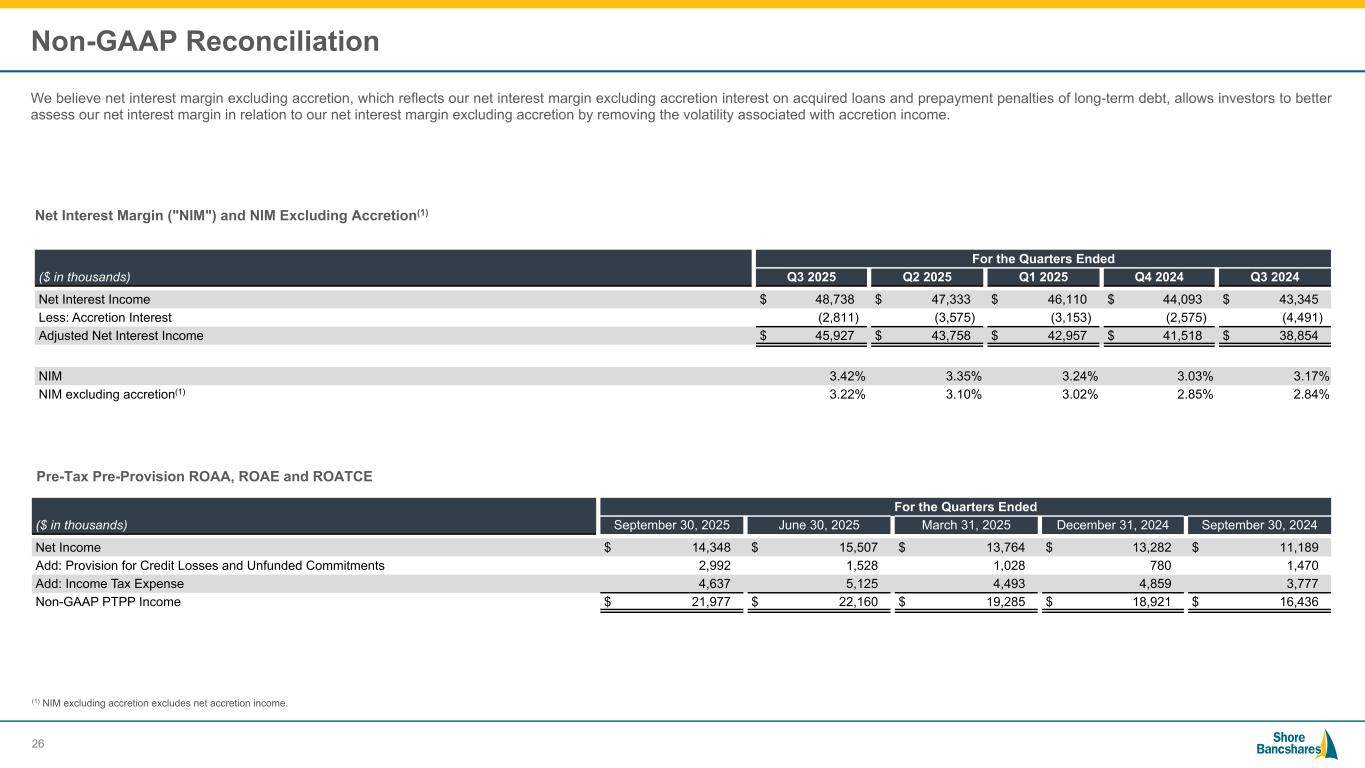 #006881 #ACC0C6 #83AFB4 #FEBE10 #5F574F #4D4F53 #C75B12 #5B8F22 #593160 Non-GAAP Reconciliation We believe net interest margin excluding accretion, which reflects our net interest margin excluding accretion interest on acquired loans and prepayment penalties of long-term debt, allows investors to better assess our net interest margin in relation to our net interest margin excluding accretion by removing the volatility associated with accretion income. Net Interest Margin ("NIM") and NIM Excluding Accretion(1) ($ in thousands) For the Quarters Ended Q3 2025 Q2 2025 Q1 2025 Q4 2024 Q3 2024 Net Interest Income $ 48,738 $ 47,333 $ 46,110 $ 44,093 $ 43,345 Less: Accretion Interest (2,811) (3,575) (3,153) (2,575) (4,491) Adjusted Net Interest Income $ 45,927 $ 43,758 $ 42,957 $ 41,518 $ 38,854 NIM 3.42 % 3.35 % 3.24 % 3.03 % 3.17 % NIM excluding accretion(1) 3.22 % 3.10 % 3.02 % 2.85 % 2.84 % (1) NIM excluding accretion excludes net accretion income. 26 Pre-Tax Pre-Provision ROAA, ROAE and ROATCE ($ in thousands) For the Quarters Ended September 30, 2025 June 30, 2025 March 31, 2025 December 31, 2024 September 30, 2024 Net Income $ 14,348 $ 15,507 $ 13,764 $ 13,282 $ 11,189 Add: Provision for Credit Losses and Unfunded Commitments 2,992 1,528 1,028 780 1,470 Add: Income Tax Expense 4,637 5,125 4,493 4,859 3,777 Non-GAAP PTPP Income $ 21,977 $ 22,160 $ 19,285 $ 18,921 $ 16,436