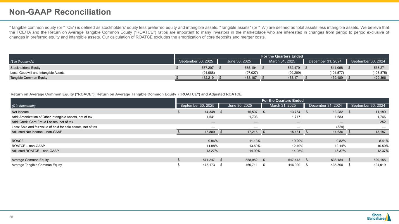 #006881 #ACC0C6 #83AFB4 #FEBE10 #5F574F #4D4F53 #C75B12 #5B8F22 #593160 Non-GAAP Reconciliation ‘‘Tangible common equity (or “TCE”) is defined as stockholders’ equity less preferred equity and intangible assets. “Tangible assets" (or “TA”) are defined as total assets less intangible assets. We believe that the TCE/TA and the Return on Average Tangible Common Equity (“ROATCE”) ratios are important to many investors in the marketplace who are interested in changes from period to period exclusive of changes in preferred equity and intangible assets. Our calculation of ROATCE excludes the amortization of core deposits and merger costs. Return on Average Common Equity ("ROACE"), Return on Average Tangible Common Equity ("ROATCE") and Adjusted ROATCE ($ in thousands) For the Quarters Ended September 30, 2025 June 30, 2025 March 31, 2025 December 31, 2024 September 30, 2024 Stockholders' Equity $ 577,207 $ 565,194 $ 552,470 $ 541,066 $ 533,271 Less: Goodwill and Intangible Assets (94,988) (97,027) (99,299) (101,577) (103,875) Tangible Common Equity $ 482,219 $ 468,167 $ 453,171 $ 439,489 $ 429,396 ($ in thousands) For the Quarters Ended September 30, 2025 June 30, 2025 March 31, 2025 December 31, 2024 September 30, 2024 Net Income $ 14,348 $ 15,507 $ 13,764 $ 13,282 $ 11,189 Add: Amortization of Other Intangible Assets, net of tax 1,541 1,708 1,717 1,683 1,746 Add: Credit Card Fraud Losses, net of tax — — — — 252 Less: Sale and fair value of held for sale assets, net of tax — — — (329) — Adjusted Net Income – non-GAAP $ 15,889 $ 17,215 $ 15,481 $ 14,636 $ 13,187 ROACE 9.96 % 11.13 % 10.20 % 9.82 % 8.41 % ROATCE – non-GAAP 11.98 % 13.50 % 12.49 % 12.14 % 10.50 % Adjusted ROATCE – non-GAAP 13.27 % 14.99 % 14.05 % 13.37 % 12.37 % Average Common Equity $ 571,247 $ 558,952 $ 547,443 $ 538,184 $ 529,155 Average Tangible Common Equity $ 475,173 $ 460,711 $ 446,929 $ 435,390 $ 424,019 28