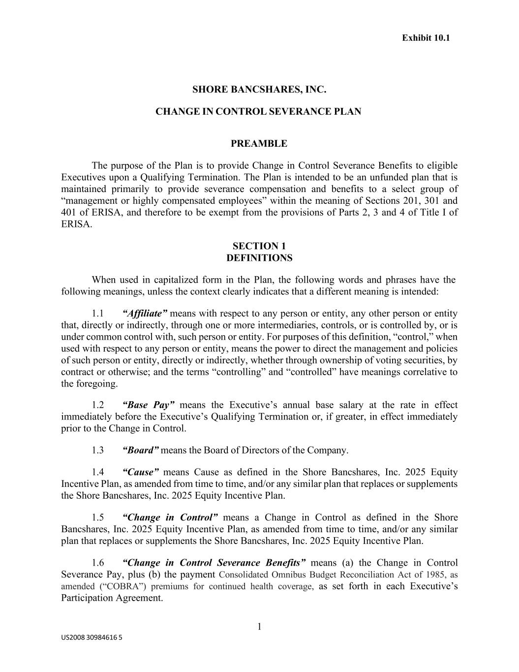 1 US2008 30984616 5 SHORE BANCSHARES, INC. CHANGE IN CONTROL SEVERANCE PLAN PREAMBLE The purpose of the Plan is to provide Change in Control Severance Benefits to eligible Executives upon a Qualifying Termination. The Plan is intended to be an unfunded plan that is maintained primarily to provide severance compensation and benefits to a select group of “management or highly compensated employees” within the meaning of Sections 201, 301 and 401 of ERISA, and therefore to be exempt from the provisions of Parts 2, 3 and 4 of Title I of ERISA. SECTION 1 DEFINITIONS When used in capitalized form in the Plan, the following words and phrases have the following meanings, unless the context clearly indicates that a different meaning is intended: 1.1 “Affiliate” means with respect to any person or entity, any other person or entity that, directly or indirectly, through one or more intermediaries, controls, or is controlled by, or is under common control with, such person or entity. For purposes of this definition, “control,” when used with respect to any person or entity, means the power to direct the management and policies of such person or entity, directly or indirectly, whether through ownership of voting securities, by contract or otherwise; and the terms “controlling” and “controlled” have meanings correlative to the foregoing. 1.2 “Base Pay” means the Executive’s annual base salary at the rate in effect immediately before the Executive’s Qualifying Termination or, if greater, in effect immediately prior to the Change in Control. 1.3 “Board” means the Board of Directors of the Company. 1.4 “Cause” means Cause as defined in the Shore Bancshares, Inc. 2025 Equity Incentive Plan, as amended from time to time, and/or any similar plan that replaces or supplements the Shore Bancshares, Inc. 2025 Equity Incentive Plan. 1.5 “Change in Control” means a Change in Control as defined in the Shore Bancshares, Inc. 2025 Equity Incentive Plan, as amended from time to time, and/or any similar plan that replaces or supplements the Shore Bancshares, Inc. 2025 Equity Incentive Plan. 1.6 “Change in Control Severance Benefits” means (a) the Change in Control Severance Pay, plus (b) the payment Consolidated Omnibus Budget Reconciliation Act of 1985, as amended (“COBRA”) premiums for continued health coverage, as set forth in each Executive’s Participation Agreement. Exhibit 10.1