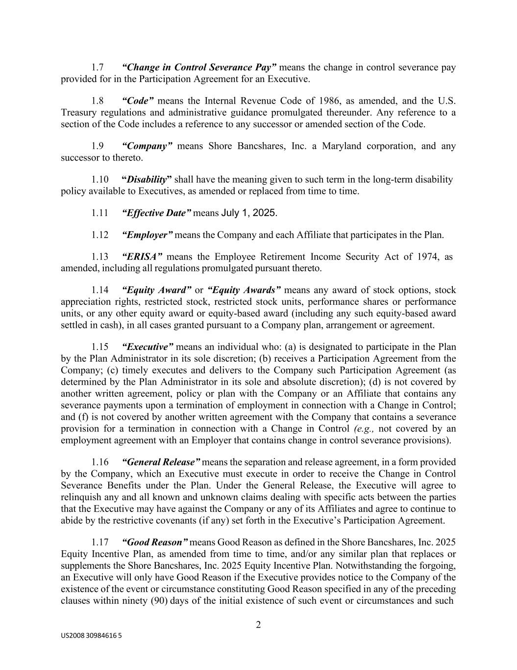 2 US2008 30984616 5 1.7 “Change in Control Severance Pay” means the change in control severance pay provided for in the Participation Agreement for an Executive. 1.8 “Code” means the Internal Revenue Code of 1986, as amended, and the U.S. Treasury regulations and administrative guidance promulgated thereunder. Any reference to a section of the Code includes a reference to any successor or amended section of the Code. 1.9 “Company” means Shore Bancshares, Inc. a Maryland corporation, and any successor to thereto. 1.10 “Disability” shall have the meaning given to such term in the long-term disability policy available to Executives, as amended or replaced from time to time. 1.11 “Effective Date” means July 1, 2025. 1.12 “Employer” means the Company and each Affiliate that participates in the Plan. 1.13 “ERISA” means the Employee Retirement Income Security Act of 1974, as amended, including all regulations promulgated pursuant thereto. 1.14 “Equity Award” or “Equity Awards” means any award of stock options, stock appreciation rights, restricted stock, restricted stock units, performance shares or performance units, or any other equity award or equity-based award (including any such equity-based award settled in cash), in all cases granted pursuant to a Company plan, arrangement or agreement. 1.15 “Executive” means an individual who: (a) is designated to participate in the Plan by the Plan Administrator in its sole discretion; (b) receives a Participation Agreement from the Company; (c) timely executes and delivers to the Company such Participation Agreement (as determined by the Plan Administrator in its sole and absolute discretion); (d) is not covered by another written agreement, policy or plan with the Company or an Affiliate that contains any severance payments upon a termination of employment in connection with a Change in Control; and (f) is not covered by another written agreement with the Company that contains a severance provision for a termination in connection with a Change in Control (e.g., not covered by an employment agreement with an Employer that contains change in control severance provisions). 1.16 “General Release” means the separation and release agreement, in a form provided by the Company, which an Executive must execute in order to receive the Change in Control Severance Benefits under the Plan. Under the General Release, the Executive will agree to relinquish any and all known and unknown claims dealing with specific acts between the parties that the Executive may have against the Company or any of its Affiliates and agree to continue to abide by the restrictive covenants (if any) set forth in the Executive’s Participation Agreement. 1.17 “Good Reason” means Good Reason as defined in the Shore Bancshares, Inc. 2025 Equity Incentive Plan, as amended from time to time, and/or any similar plan that replaces or supplements the Shore Bancshares, Inc. 2025 Equity Incentive Plan. Notwithstanding the forgoing, an Executive will only have Good Reason if the Executive provides notice to the Company of the existence of the event or circumstance constituting Good Reason specified in any of the preceding clauses within ninety (90) days of the initial existence of such event or circumstances and such