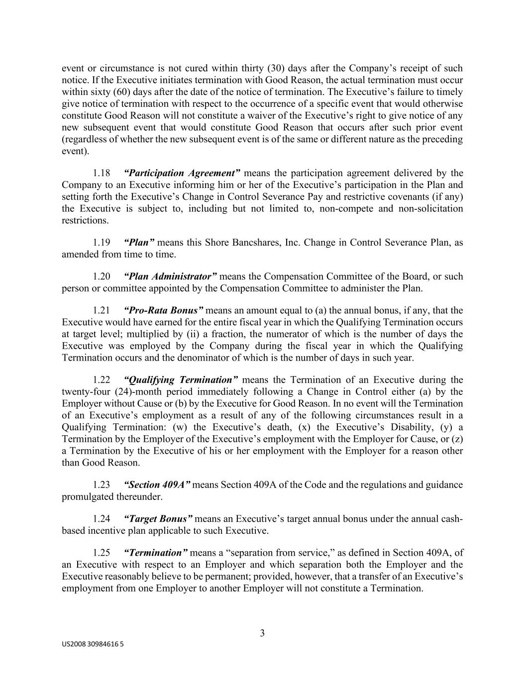 3 US2008 30984616 5 event or circumstance is not cured within thirty (30) days after the Company’s receipt of such notice. If the Executive initiates termination with Good Reason, the actual termination must occur within sixty (60) days after the date of the notice of termination. The Executive’s failure to timely give notice of termination with respect to the occurrence of a specific event that would otherwise constitute Good Reason will not constitute a waiver of the Executive’s right to give notice of any new subsequent event that would constitute Good Reason that occurs after such prior event (regardless of whether the new subsequent event is of the same or different nature as the preceding event). 1.18 “Participation Agreement” means the participation agreement delivered by the Company to an Executive informing him or her of the Executive’s participation in the Plan and setting forth the Executive’s Change in Control Severance Pay and restrictive covenants (if any) the Executive is subject to, including but not limited to, non-compete and non-solicitation restrictions. 1.19 “Plan” means this Shore Bancshares, Inc. Change in Control Severance Plan, as amended from time to time. 1.20 “Plan Administrator” means the Compensation Committee of the Board, or such person or committee appointed by the Compensation Committee to administer the Plan. 1.21 “Pro-Rata Bonus” means an amount equal to (a) the annual bonus, if any, that the Executive would have earned for the entire fiscal year in which the Qualifying Termination occurs at target level; multiplied by (ii) a fraction, the numerator of which is the number of days the Executive was employed by the Company during the fiscal year in which the Qualifying Termination occurs and the denominator of which is the number of days in such year. 1.22 “Qualifying Termination” means the Termination of an Executive during the twenty-four (24)-month period immediately following a Change in Control either (a) by the Employer without Cause or (b) by the Executive for Good Reason. In no event will the Termination of an Executive’s employment as a result of any of the following circumstances result in a Qualifying Termination: (w) the Executive’s death, (x) the Executive’s Disability, (y) a Termination by the Employer of the Executive’s employment with the Employer for Cause, or (z) a Termination by the Executive of his or her employment with the Employer for a reason other than Good Reason. 1.23 “Section 409A” means Section 409A of the Code and the regulations and guidance promulgated thereunder. 1.24 “Target Bonus” means an Executive’s target annual bonus under the annual cash- based incentive plan applicable to such Executive. 1.25 “Termination” means a “separation from service,” as defined in Section 409A, of an Executive with respect to an Employer and which separation both the Employer and the Executive reasonably believe to be permanent; provided, however, that a transfer of an Executive’s employment from one Employer to another Employer will not constitute a Termination.