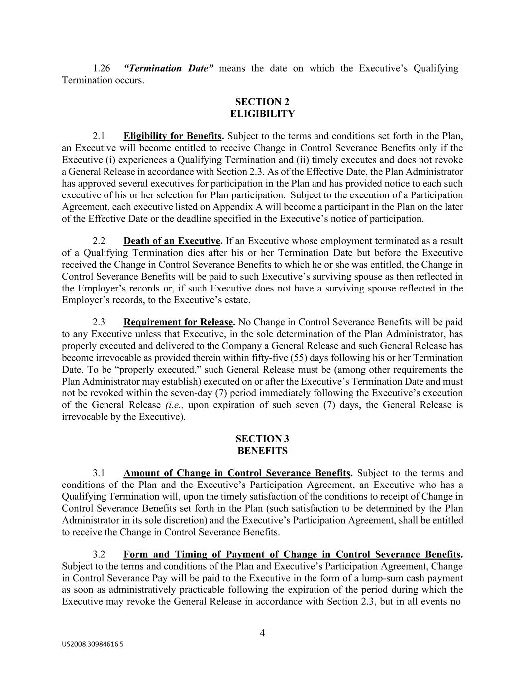 4 US2008 30984616 5 1.26 “Termination Date” means the date on which the Executive’s Qualifying Termination occurs. SECTION 2 ELIGIBILITY 2.1 Eligibility for Benefits. Subject to the terms and conditions set forth in the Plan, an Executive will become entitled to receive Change in Control Severance Benefits only if the Executive (i) experiences a Qualifying Termination and (ii) timely executes and does not revoke a General Release in accordance with Section 2.3. As of the Effective Date, the Plan Administrator has approved several executives for participation in the Plan and has provided notice to each such executive of his or her selection for Plan participation. Subject to the execution of a Participation Agreement, each executive listed on Appendix A will become a participant in the Plan on the later of the Effective Date or the deadline specified in the Executive’s notice of participation. 2.2 Death of an Executive. If an Executive whose employment terminated as a result of a Qualifying Termination dies after his or her Termination Date but before the Executive received the Change in Control Severance Benefits to which he or she was entitled, the Change in Control Severance Benefits will be paid to such Executive’s surviving spouse as then reflected in the Employer’s records or, if such Executive does not have a surviving spouse reflected in the Employer’s records, to the Executive’s estate. 2.3 Requirement for Release. No Change in Control Severance Benefits will be paid to any Executive unless that Executive, in the sole determination of the Plan Administrator, has properly executed and delivered to the Company a General Release and such General Release has become irrevocable as provided therein within fifty-five (55) days following his or her Termination Date. To be “properly executed,” such General Release must be (among other requirements the Plan Administrator may establish) executed on or after the Executive’s Termination Date and must not be revoked within the seven-day (7) period immediately following the Executive’s execution of the General Release (i.e., upon expiration of such seven (7) days, the General Release is irrevocable by the Executive). SECTION 3 BENEFITS 3.1 Amount of Change in Control Severance Benefits. Subject to the terms and conditions of the Plan and the Executive’s Participation Agreement, an Executive who has a Qualifying Termination will, upon the timely satisfaction of the conditions to receipt of Change in Control Severance Benefits set forth in the Plan (such satisfaction to be determined by the Plan Administrator in its sole discretion) and the Executive’s Participation Agreement, shall be entitled to receive the Change in Control Severance Benefits. 3.2 Form and Timing of Payment of Change in Control Severance Benefits. Subject to the terms and conditions of the Plan and Executive’s Participation Agreement, Change in Control Severance Pay will be paid to the Executive in the form of a lump-sum cash payment as soon as administratively practicable following the expiration of the period during which the Executive may revoke the General Release in accordance with Section 2.3, but in all events no