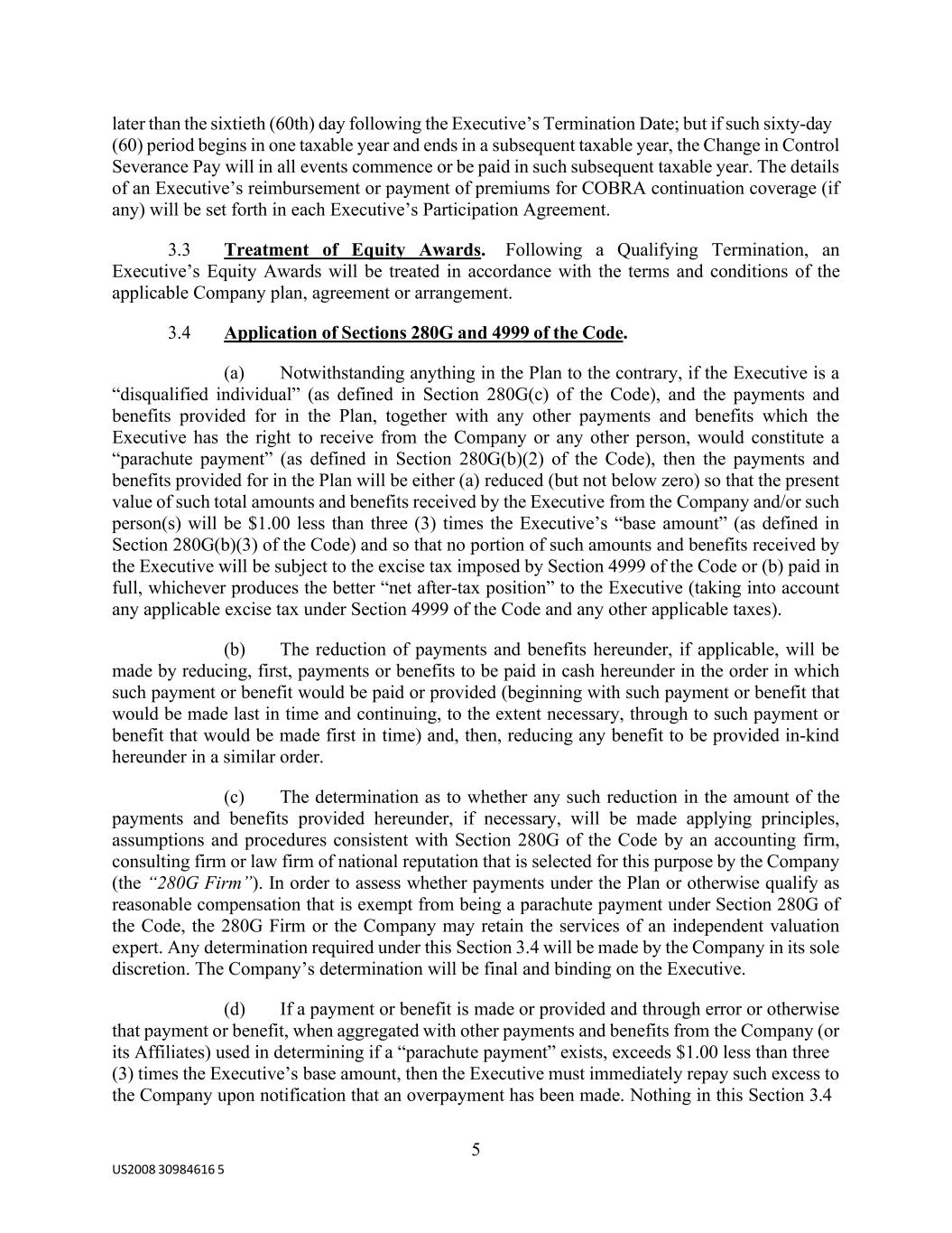 5 US2008 30984616 5 later than the sixtieth (60th) day following the Executive’s Termination Date; but if such sixty-day (60) period begins in one taxable year and ends in a subsequent taxable year, the Change in Control Severance Pay will in all events commence or be paid in such subsequent taxable year. The details of an Executive’s reimbursement or payment of premiums for COBRA continuation coverage (if any) will be set forth in each Executive’s Participation Agreement. 3.3 Treatment of Equity Awards. Following a Qualifying Termination, an Executive’s Equity Awards will be treated in accordance with the terms and conditions of the applicable Company plan, agreement or arrangement. 3.4 Application of Sections 280G and 4999 of the Code. (a) Notwithstanding anything in the Plan to the contrary, if the Executive is a “disqualified individual” (as defined in Section 280G(c) of the Code), and the payments and benefits provided for in the Plan, together with any other payments and benefits which the Executive has the right to receive from the Company or any other person, would constitute a “parachute payment” (as defined in Section 280G(b)(2) of the Code), then the payments and benefits provided for in the Plan will be either (a) reduced (but not below zero) so that the present value of such total amounts and benefits received by the Executive from the Company and/or such person(s) will be $1.00 less than three (3) times the Executive’s “base amount” (as defined in Section 280G(b)(3) of the Code) and so that no portion of such amounts and benefits received by the Executive will be subject to the excise tax imposed by Section 4999 of the Code or (b) paid in full, whichever produces the better “net after-tax position” to the Executive (taking into account any applicable excise tax under Section 4999 of the Code and any other applicable taxes). (b) The reduction of payments and benefits hereunder, if applicable, will be made by reducing, first, payments or benefits to be paid in cash hereunder in the order in which such payment or benefit would be paid or provided (beginning with such payment or benefit that would be made last in time and continuing, to the extent necessary, through to such payment or benefit that would be made first in time) and, then, reducing any benefit to be provided in-kind hereunder in a similar order. (c) The determination as to whether any such reduction in the amount of the payments and benefits provided hereunder, if necessary, will be made applying principles, assumptions and procedures consistent with Section 280G of the Code by an accounting firm, consulting firm or law firm of national reputation that is selected for this purpose by the Company (the “280G Firm”). In order to assess whether payments under the Plan or otherwise qualify as reasonable compensation that is exempt from being a parachute payment under Section 280G of the Code, the 280G Firm or the Company may retain the services of an independent valuation expert. Any determination required under this Section 3.4 will be made by the Company in its sole discretion. The Company’s determination will be final and binding on the Executive. (d) If a payment or benefit is made or provided and through error or otherwise that payment or benefit, when aggregated with other payments and benefits from the Company (or its Affiliates) used in determining if a “parachute payment” exists, exceeds $1.00 less than three (3) times the Executive’s base amount, then the Executive must immediately repay such excess to the Company upon notification that an overpayment has been made. Nothing in this Section 3.4