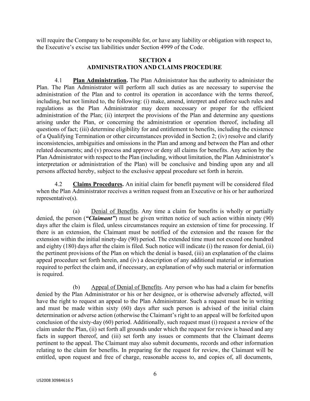 6 US2008 30984616 5 will require the Company to be responsible for, or have any liability or obligation with respect to, the Executive’s excise tax liabilities under Section 4999 of the Code. SECTION 4 ADMINISTRATION AND CLAIMS PROCEDURE 4.1 Plan Administration. The Plan Administrator has the authority to administer the Plan. The Plan Administrator will perform all such duties as are necessary to supervise the administration of the Plan and to control its operation in accordance with the terms thereof, including, but not limited to, the following: (i) make, amend, interpret and enforce such rules and regulations as the Plan Administrator may deem necessary or proper for the efficient administration of the Plan; (ii) interpret the provisions of the Plan and determine any questions arising under the Plan, or concerning the administration or operation thereof, including all questions of fact; (iii) determine eligibility for and entitlement to benefits, including the existence of a Qualifying Termination or other circumstances provided in Section 2; (iv) resolve and clarify inconsistencies, ambiguities and omissions in the Plan and among and between the Plan and other related documents; and (v) process and approve or deny all claims for benefits. Any action by the Plan Administrator with respect to the Plan (including, without limitation, the Plan Administrator’s interpretation or administration of the Plan) will be conclusive and binding upon any and all persons affected hereby, subject to the exclusive appeal procedure set forth in herein. 4.2 Claims Procedures. An initial claim for benefit payment will be considered filed when the Plan Administrator receives a written request from an Executive or his or her authorized representative(s). (a) Denial of Benefits. Any time a claim for benefits is wholly or partially denied, the person (“Claimant”) must be given written notice of such action within ninety (90) days after the claim is filed, unless circumstances require an extension of time for processing. If there is an extension, the Claimant must be notified of the extension and the reason for the extension within the initial ninety-day (90) period. The extended time must not exceed one hundred and eighty (180) days after the claim is filed. Such notice will indicate (i) the reason for denial, (ii) the pertinent provisions of the Plan on which the denial is based, (iii) an explanation of the claims appeal procedure set forth herein, and (iv) a description of any additional material or information required to perfect the claim and, if necessary, an explanation of why such material or information is required. (b) Appeal of Denial of Benefits. Any person who has had a claim for benefits denied by the Plan Administrator or his or her designee, or is otherwise adversely affected, will have the right to request an appeal to the Plan Administrator. Such a request must be in writing and must be made within sixty (60) days after such person is advised of the initial claim determination or adverse action (otherwise the Claimant’s right to an appeal will be forfeited upon conclusion of the sixty-day (60) period. Additionally, such request must (i) request a review of the claim under the Plan, (ii) set forth all grounds under which the request for review is based and any facts in support thereof, and (iii) set forth any issues or comments that the Claimant deems pertinent to the appeal. The Claimant may also submit documents, records and other information relating to the claim for benefits. In preparing for the request for review, the Claimant will be entitled, upon request and free of charge, reasonable access to, and copies of, all documents,