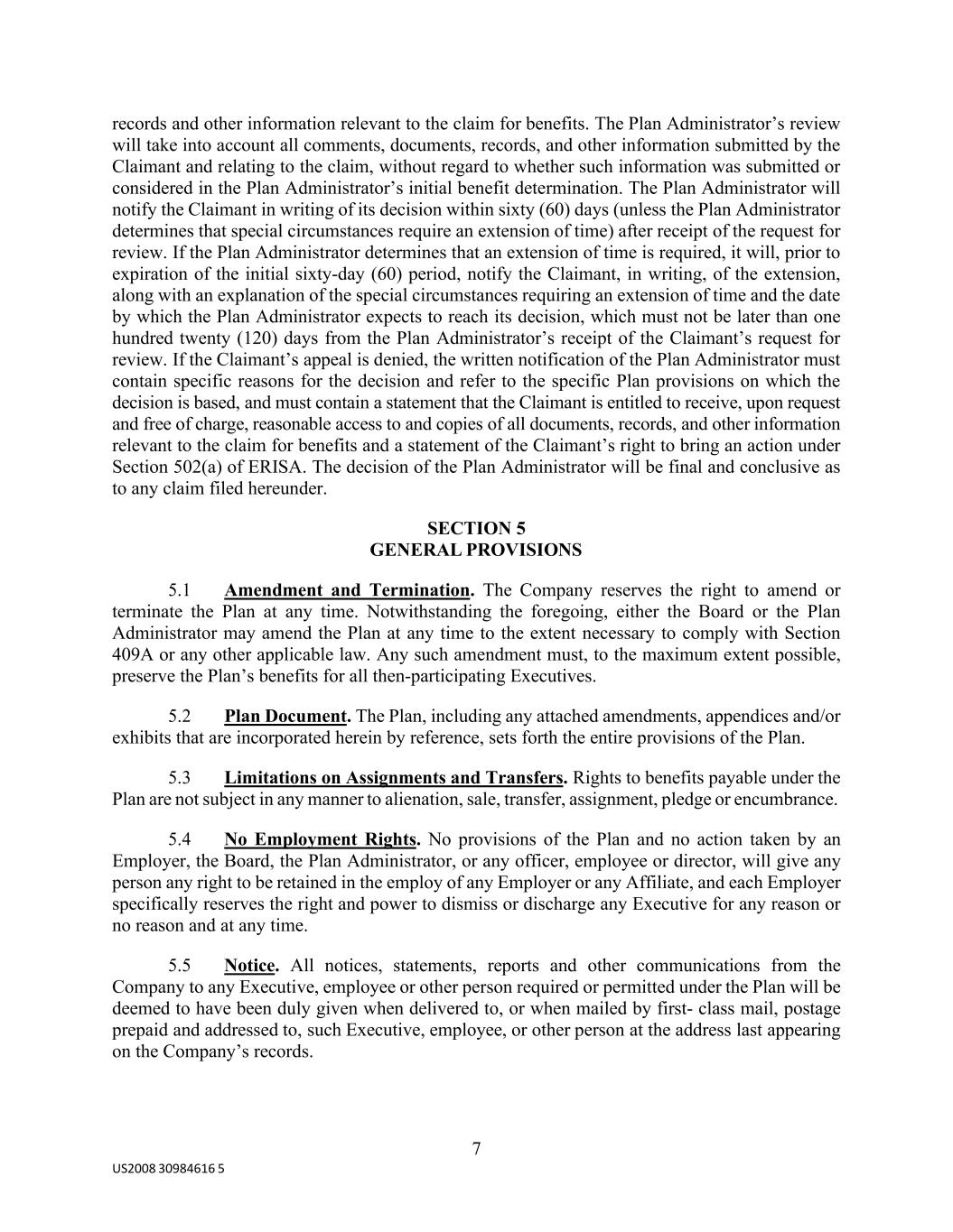 7 US2008 30984616 5 records and other information relevant to the claim for benefits. The Plan Administrator’s review will take into account all comments, documents, records, and other information submitted by the Claimant and relating to the claim, without regard to whether such information was submitted or considered in the Plan Administrator’s initial benefit determination. The Plan Administrator will notify the Claimant in writing of its decision within sixty (60) days (unless the Plan Administrator determines that special circumstances require an extension of time) after receipt of the request for review. If the Plan Administrator determines that an extension of time is required, it will, prior to expiration of the initial sixty-day (60) period, notify the Claimant, in writing, of the extension, along with an explanation of the special circumstances requiring an extension of time and the date by which the Plan Administrator expects to reach its decision, which must not be later than one hundred twenty (120) days from the Plan Administrator’s receipt of the Claimant’s request for review. If the Claimant’s appeal is denied, the written notification of the Plan Administrator must contain specific reasons for the decision and refer to the specific Plan provisions on which the decision is based, and must contain a statement that the Claimant is entitled to receive, upon request and free of charge, reasonable access to and copies of all documents, records, and other information relevant to the claim for benefits and a statement of the Claimant’s right to bring an action under Section 502(a) of ERISA. The decision of the Plan Administrator will be final and conclusive as to any claim filed hereunder. SECTION 5 GENERAL PROVISIONS 5.1 Amendment and Termination. The Company reserves the right to amend or terminate the Plan at any time. Notwithstanding the foregoing, either the Board or the Plan Administrator may amend the Plan at any time to the extent necessary to comply with Section 409A or any other applicable law. Any such amendment must, to the maximum extent possible, preserve the Plan’s benefits for all then-participating Executives. 5.2 Plan Document. The Plan, including any attached amendments, appendices and/or exhibits that are incorporated herein by reference, sets forth the entire provisions of the Plan. 5.3 Limitations on Assignments and Transfers. Rights to benefits payable under the Plan are not subject in any manner to alienation, sale, transfer, assignment, pledge or encumbrance. 5.4 No Employment Rights. No provisions of the Plan and no action taken by an Employer, the Board, the Plan Administrator, or any officer, employee or director, will give any person any right to be retained in the employ of any Employer or any Affiliate, and each Employer specifically reserves the right and power to dismiss or discharge any Executive for any reason or no reason and at any time. 5.5 Notice. All notices, statements, reports and other communications from the Company to any Executive, employee or other person required or permitted under the Plan will be deemed to have been duly given when delivered to, or when mailed by first- class mail, postage prepaid and addressed to, such Executive, employee, or other person at the address last appearing on the Company’s records.