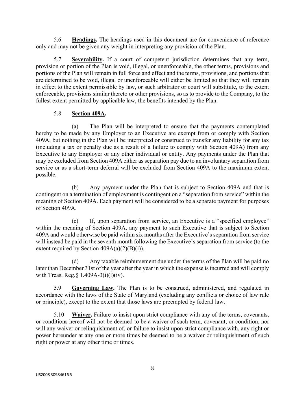 8 US2008 30984616 5 5.6 Headings. The headings used in this document are for convenience of reference only and may not be given any weight in interpreting any provision of the Plan. 5.7 Severability. If a court of competent jurisdiction determines that any term, provision or portion of the Plan is void, illegal, or unenforceable, the other terms, provisions and portions of the Plan will remain in full force and effect and the terms, provisions, and portions that are determined to be void, illegal or unenforceable will either be limited so that they will remain in effect to the extent permissible by law, or such arbitrator or court will substitute, to the extent enforceable, provisions similar thereto or other provisions, so as to provide to the Company, to the fullest extent permitted by applicable law, the benefits intended by the Plan. 5.8 Section 409A. (a) The Plan will be interpreted to ensure that the payments contemplated hereby to be made by any Employer to an Executive are exempt from or comply with Section 409A; but nothing in the Plan will be interpreted or construed to transfer any liability for any tax (including a tax or penalty due as a result of a failure to comply with Section 409A) from any Executive to any Employer or any other individual or entity. Any payments under the Plan that may be excluded from Section 409A either as separation pay due to an involuntary separation from service or as a short-term deferral will be excluded from Section 409A to the maximum extent possible. (b) Any payment under the Plan that is subject to Section 409A and that is contingent on a termination of employment is contingent on a “separation from service” within the meaning of Section 409A. Each payment will be considered to be a separate payment for purposes of Section 409A. (c) If, upon separation from service, an Executive is a “specified employee” within the meaning of Section 409A, any payment to such Executive that is subject to Section 409A and would otherwise be paid within six months after the Executive’s separation from service will instead be paid in the seventh month following the Executive’s separation from service (to the extent required by Section 409A(a)(2)(B)(i)). (d) Any taxable reimbursement due under the terms of the Plan will be paid no later than December 31st of the year after the year in which the expense is incurred and will comply with Treas. Reg.§ 1.409A-3(i)(l)(iv). 5.9 Governing Law. The Plan is to be construed, administered, and regulated in accordance with the laws of the State of Maryland (excluding any conflicts or choice of law rule or principle), except to the extent that those laws are preempted by federal law. 5.10 Waiver. Failure to insist upon strict compliance with any of the terms, covenants, or conditions hereof will not be deemed to be a waiver of such term, covenant, or condition, nor will any waiver or relinquishment of, or failure to insist upon strict compliance with, any right or power hereunder at any one or more times be deemed to be a waiver or relinquishment of such right or power at any other time or times.