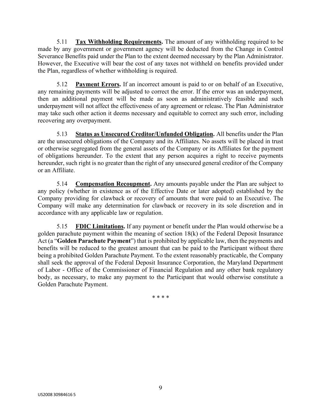 9 US2008 30984616 5 5.11 Tax Withholding Requirements. The amount of any withholding required to be made by any government or government agency will be deducted from the Change in Control Severance Benefits paid under the Plan to the extent deemed necessary by the Plan Administrator. However, the Executive will bear the cost of any taxes not withheld on benefits provided under the Plan, regardless of whether withholding is required. 5.12 Payment Errors. If an incorrect amount is paid to or on behalf of an Executive, any remaining payments will be adjusted to correct the error. If the error was an underpayment, then an additional payment will be made as soon as administratively feasible and such underpayment will not affect the effectiveness of any agreement or release. The Plan Administrator may take such other action it deems necessary and equitable to correct any such error, including recovering any overpayment. 5.13 Status as Unsecured Creditor/Unfunded Obligation. All benefits under the Plan are the unsecured obligations of the Company and its Affiliates. No assets will be placed in trust or otherwise segregated from the general assets of the Company or its Affiliates for the payment of obligations hereunder. To the extent that any person acquires a right to receive payments hereunder, such right is no greater than the right of any unsecured general creditor of the Company or an Affiliate. 5.14 Compensation Recoupment. Any amounts payable under the Plan are subject to any policy (whether in existence as of the Effective Date or later adopted) established by the Company providing for clawback or recovery of amounts that were paid to an Executive. The Company will make any determination for clawback or recovery in its sole discretion and in accordance with any applicable law or regulation. 5.15 FDIC Limitations. If any payment or benefit under the Plan would otherwise be a golden parachute payment within the meaning of section 18(k) of the Federal Deposit Insurance Act (a “Golden Parachute Payment”) that is prohibited by applicable law, then the payments and benefits will be reduced to the greatest amount that can be paid to the Participant without there being a prohibited Golden Parachute Payment. To the extent reasonably practicable, the Company shall seek the approval of the Federal Deposit Insurance Corporation, the Maryland Department of Labor - Office of the Commissioner of Financial Regulation and any other bank regulatory body, as necessary, to make any payment to the Participant that would otherwise constitute a Golden Parachute Payment. * * * *