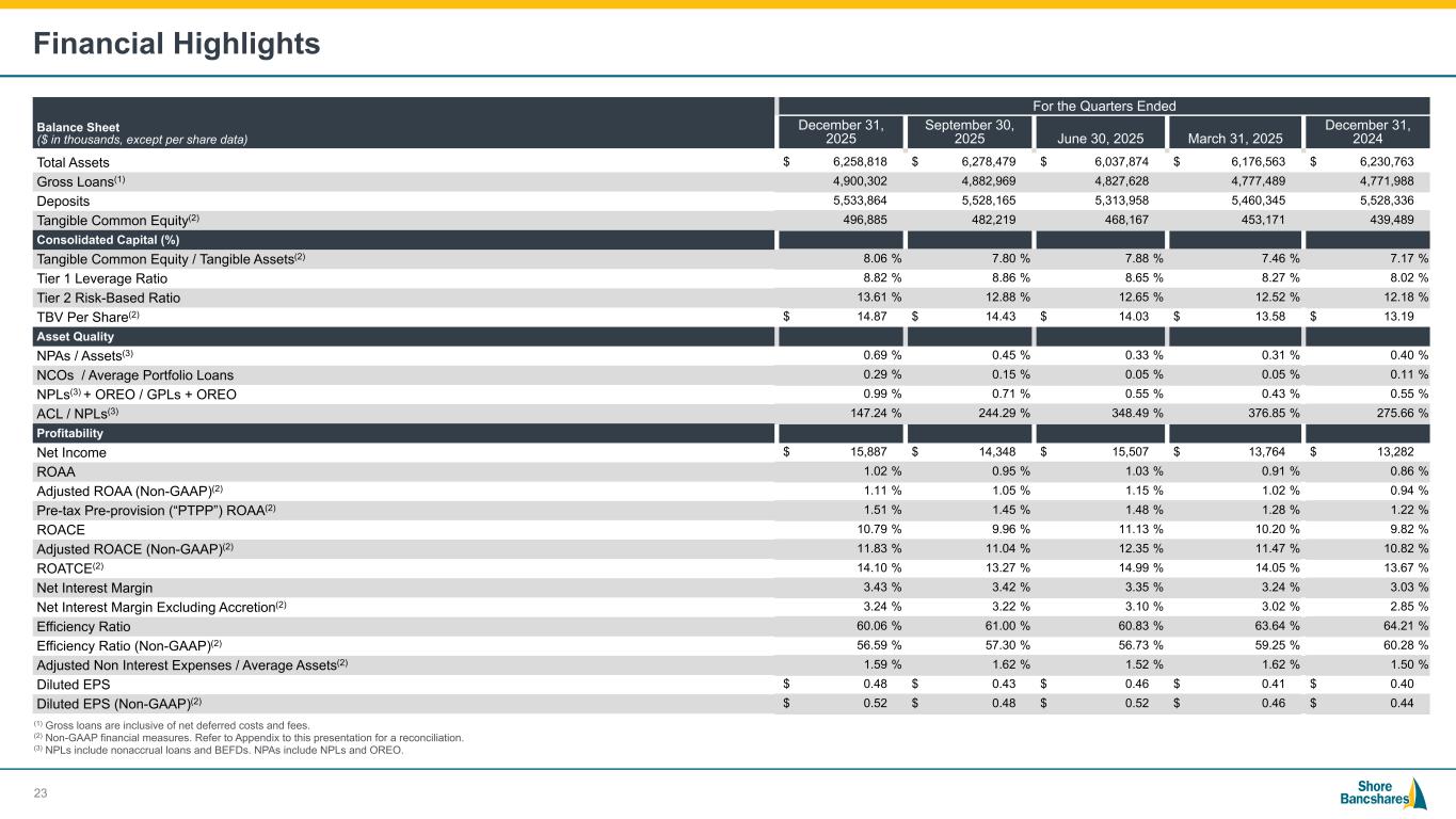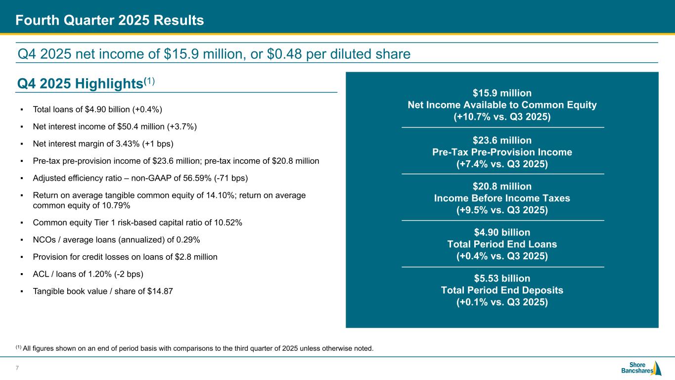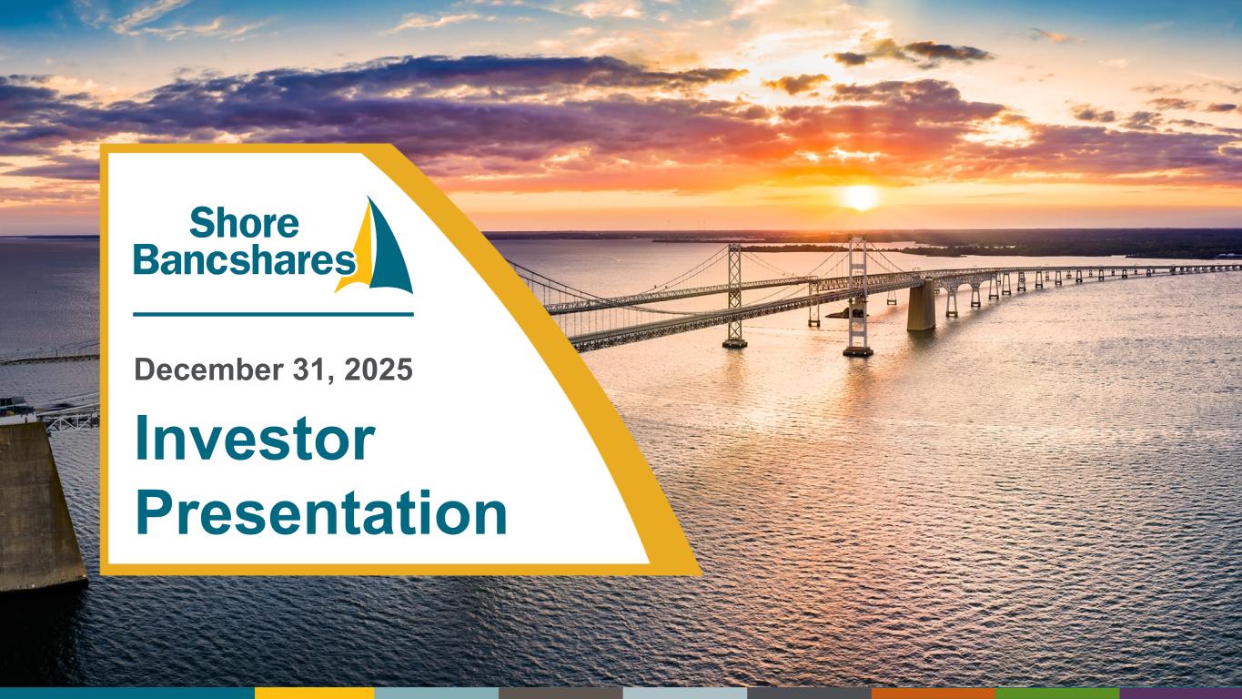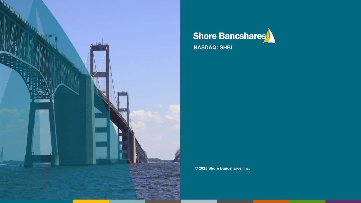 #006881 #ACC0C6 #83AFB4 #FEBE10 #5F574F #4D4F53 #C75B12 #5B8F22 #593160 Forward-Looking Statements The statements contained in this presentation that are not historical facts are forward-looking statements (as defined by the Private Securities Litigation Reform Act of 1995) based on management’s current expectations and beliefs concerning future developments and their potential effects on Shore Bancshares, Inc. (the “Company”). Such statements involve inherent risks and uncertainties, many of which are difficult to predict and are generally beyond the control of the Company. There can be no assurance that future developments affecting the Company will be the same as those anticipated by management. These statements are evidenced by terms such as “anticipate,” “estimate,” “should,” “expect,” “believe,” “intend,” and similar expressions. Although these statements reflect management’s good faith beliefs and projections, they are not guarantees of future performance and they may not prove true. These projections involve risk and uncertainties that could cause actual results to differ materially from those addressed in the forward-looking statements. While there is no assurance that any list of risks and uncertainties or risk factors is complete, below are certain factors which could cause actual results to differ materially from those contained or implied in the forward-looking statements: the strength of the United States (“U.S.”) economy and general economic conditions, (including the interest rate environment, government economic and monetary policies, the strength of global financial markets and inflation/deflation and supply chain issues), whether national or regional, and conditions in the lending markets in which we participate that may have an adverse effect on the demand for our loans and other products, our credit quality and related levels of nonperforming assets and loan losses, and the value and salability of the real estate that we own or that is the collateral for our loans; the ability to effectively manage the information technology systems, including third-party vendors, cyber or data privacy incidents or other failures, disruptions or security breaches, and risk related to the development and use of artificial intelligence; the ability to develop and use technologies to provide products and services that will satisfy customer demands; results of examinations of us by our regulators, including the possibility that our regulators may, among other things, require us to increase our reserve for loan losses or to write-down assets; changing bank regulatory conditions, policies or programs, whether arising as new legislation or regulatory initiatives, which could lead to restrictions on activities of banks generally, or our subsidiary bank in particular, more restrictive regulatory capital requirements, increased costs, including deposit insurance premiums, regulation or prohibition of certain income producing activities or changes in the secondary market for loans and other products; changes in market rates and prices may adversely impact the value of securities, loans, deposits and other financial instruments and the interest rate sensitivity of our balance sheet; our liquidity requirements could be adversely affected by changes in our assets and liabilities; our ability to prudently manage our growth and execute our strategy; impairment of our goodwill and intangible assets; competitive factors among financial services organizations, including product and pricing pressures and our ability to attract, develop and retain qualified banking professionals; the effect of acquisitions we have made or may make, including, without limitation, the failure to achieve the expected revenue growth and/or expense savings from such acquisitions, and/or the failure to effectively integrate an acquisition target into our operations; the growth and profitability of noninterest or fee income being less than expected; the effect of legislative or regulatory developments, including changes in laws concerning taxes, banking, securities, insurance and other aspects of the financial services industry; the effect of any change in federal government enforcement of federal laws affecting the cannabis industry; the effect of changes in accounting policies and practices, as may be adopted by the Financial Accounting Standards Board, the U.S. Securities and Exchange Commission (the “SEC”), the Public Company Accounting Oversight Board and other regulatory agencies; changes in U.S. trade policies, including the implementation of tariffs and other protectionist trade policies; the impact of governmental efforts to restructure or adjust the U.S. financial regulatory system; the impact of recent or future changes in Federal Deposit Insurance Corporation (the “FDIC”) insurance assessment rate or the rules and regulations related to the calculation of the FDIC insurance assessment amount, including any special assessments; the effects of federal government shutdowns, debt ceiling standoff, or other uncertainty regarding fiscal and governmental policies of the U.S. federal government; climate change and other catastrophic events or disasters; geopolitical conditions, including acts or threats of terrorism, actions taken by the United States or other governments in response to acts of terrorism, and/or military conflicts, which could impact business and economic conditions in the United States and abroad; and other factors that may affect our future results. Additional factors that could cause actual results to differ materially from those expressed in the forward-looking statements are discussed in the Company’s 2024 Annual Report on Form 10-K filed with the SEC and available at the SEC’s Internet site (https://www.sec.gov). This presentation has been prepared by the Company solely for informational purposes based on its own information, as well as information from 