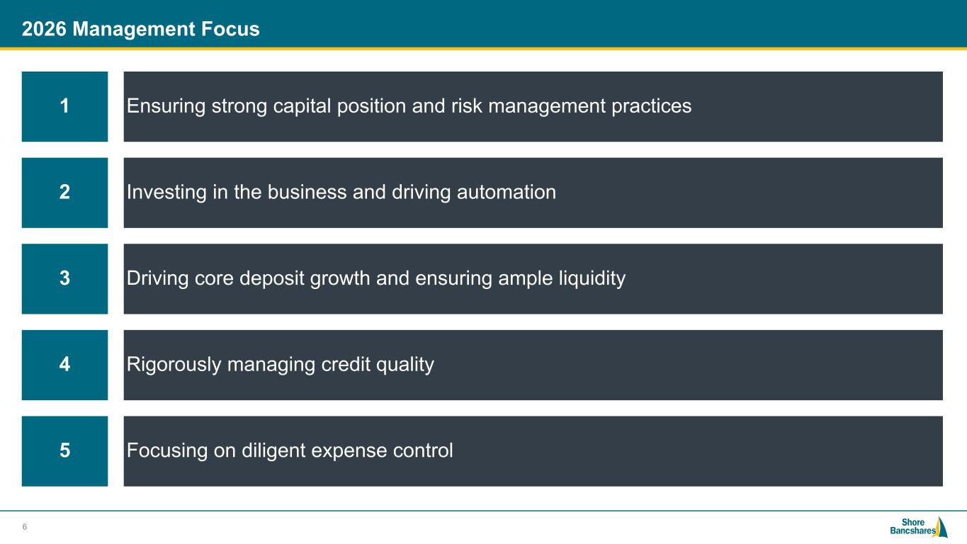 #006881 #ACC0C6 #83AFB4 #FEBE10 #5F574F #4D4F53 #C75B12 #5B8F22 #593160 2026 Management Focus 6 1 Ensuring strong capital position and risk management practices 2 Investing in the business and driving automation 3 Driving core deposit growth and ensuring ample liquidity 4 Rigorously managing credit quality 5 Focusing on diligent expense control