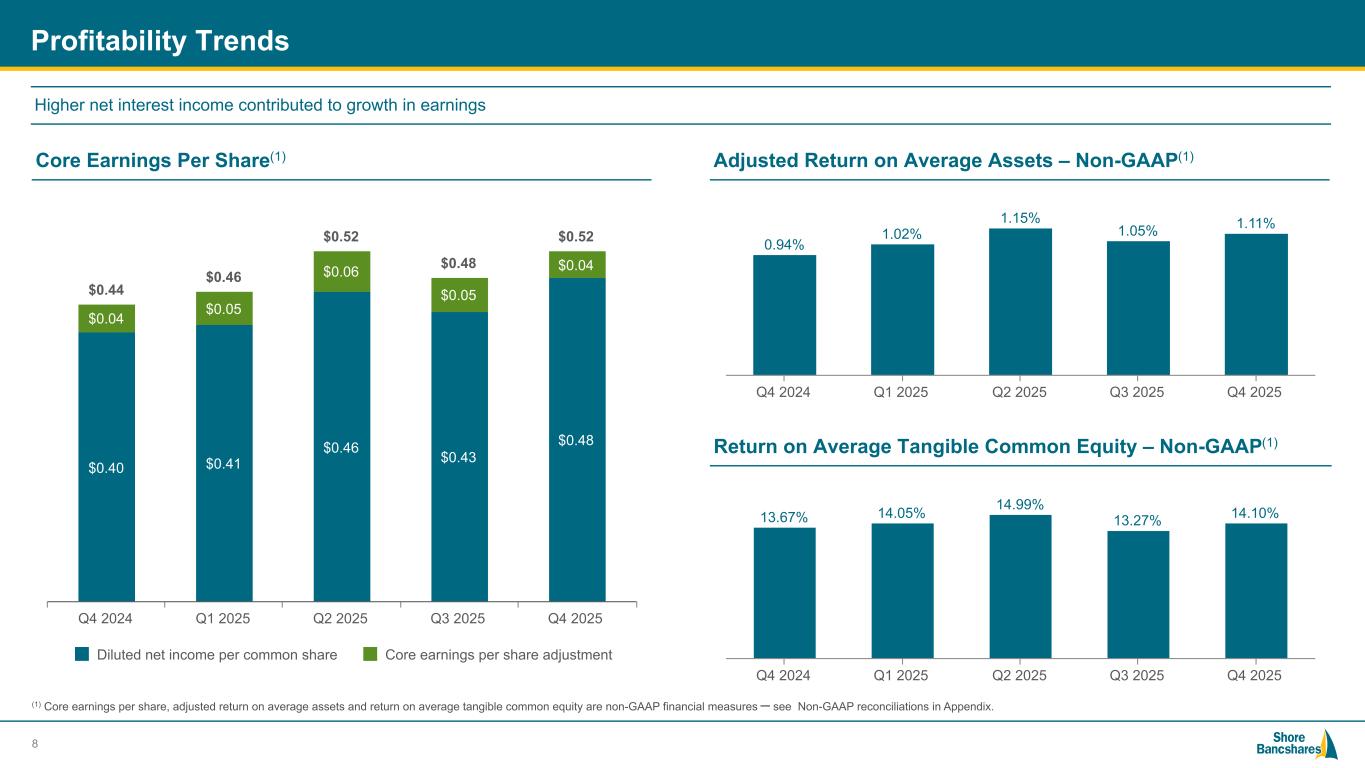 #006881 #ACC0C6 #83AFB4 #FEBE10 #5F574F #4D4F53 #C75B12 #5B8F22 #593160 Fourth Quarter 2025 Results (1) All figures shown on an end of period basis with comparisons to the third quarter of 2025 unless otherwise noted. 7 Q4 2025 net income of $15.9 million, or $0.48 per diluted share Q4 2025 Highlights(1) $15.9 million Net Income Available to Common Equity (+10.7% vs. Q3 2025) $23.6 million Pre-Tax Pre-Provision Income (+7.4% vs. Q3 2025) $20.8 million Income Before Income Taxes (+9.5% vs. Q3 2025) $4.90 billion Total Period End Loans (+0.4% vs. Q3 2025) $5.53 billion Total Period End Deposits (+0.1% vs. Q3 2025) ▪ Total loans of $4.90 billion (+0.4%) ▪ Net interest income of $50.4 million (+3.7%) ▪ Net interest margin of 3.43% (+1 bps) ▪ Pre-tax pre-provision income of $23.6 million; pre-tax income of $20.8 million ▪ Adjusted efficiency ratio – non-GAAP of 56.59% (-71 bps) ▪ Return on average tangible common equity of 14.10%; return on average common equity of 10.79% ▪ Common equity Tier 1 risk-based capital ratio of 10.52% ▪ NCOs / average loans (annualized) of 0.29% ▪ Provision for credit losses on loans of $2.8 million ▪ ACL / loans of 1.20% (-2 bps) ▪ Tangible book value / share of $14.87