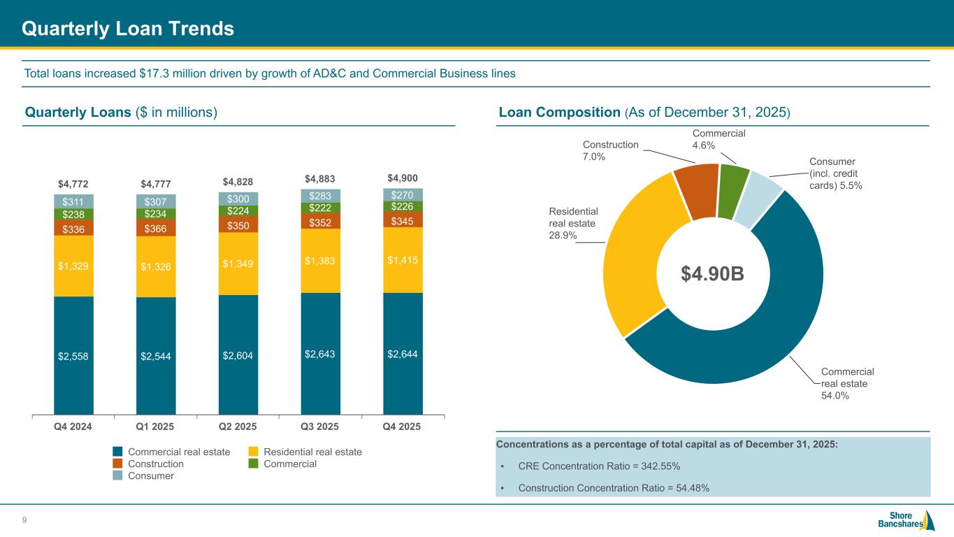 #006881 #ACC0C6 #83AFB4 #FEBE10 #5F574F #4D4F53 #C75B12 #5B8F22 #593160 Profitability Trends (1) Core earnings per share, adjusted return on average assets and return on average tangible common equity are non-GAAP financial measures – see Non-GAAP reconciliations in Appendix. 0.94% 1.02% 1.15% 1.05% 1.11% Q4 2024 Q1 2025 Q2 2025 Q3 2025 Q4 2025 13.67% 14.05% 14.99% 13.27% 14.10% Q4 2024 Q1 2025 Q2 2025 Q3 2025 Q4 2025 8 $0.44 $0.46 $0.52 $0.48 $0.52 $0.40 $0.41 $0.46 $0.43 $0.48 $0.04 $0.05 $0.06 $0.05 $0.04 Diluted net income per common share Core earnings per share adjustment Q4 2024 Q1 2025 Q2 2025 Q3 2025 Q4 2025 Higher net interest income contributed to growth in earnings Core Earnings Per Share(1) Adjusted Return on Average Assets – Non-GAAP(1) Return on Average Tangible Common Equity – Non-GAAP(1)
