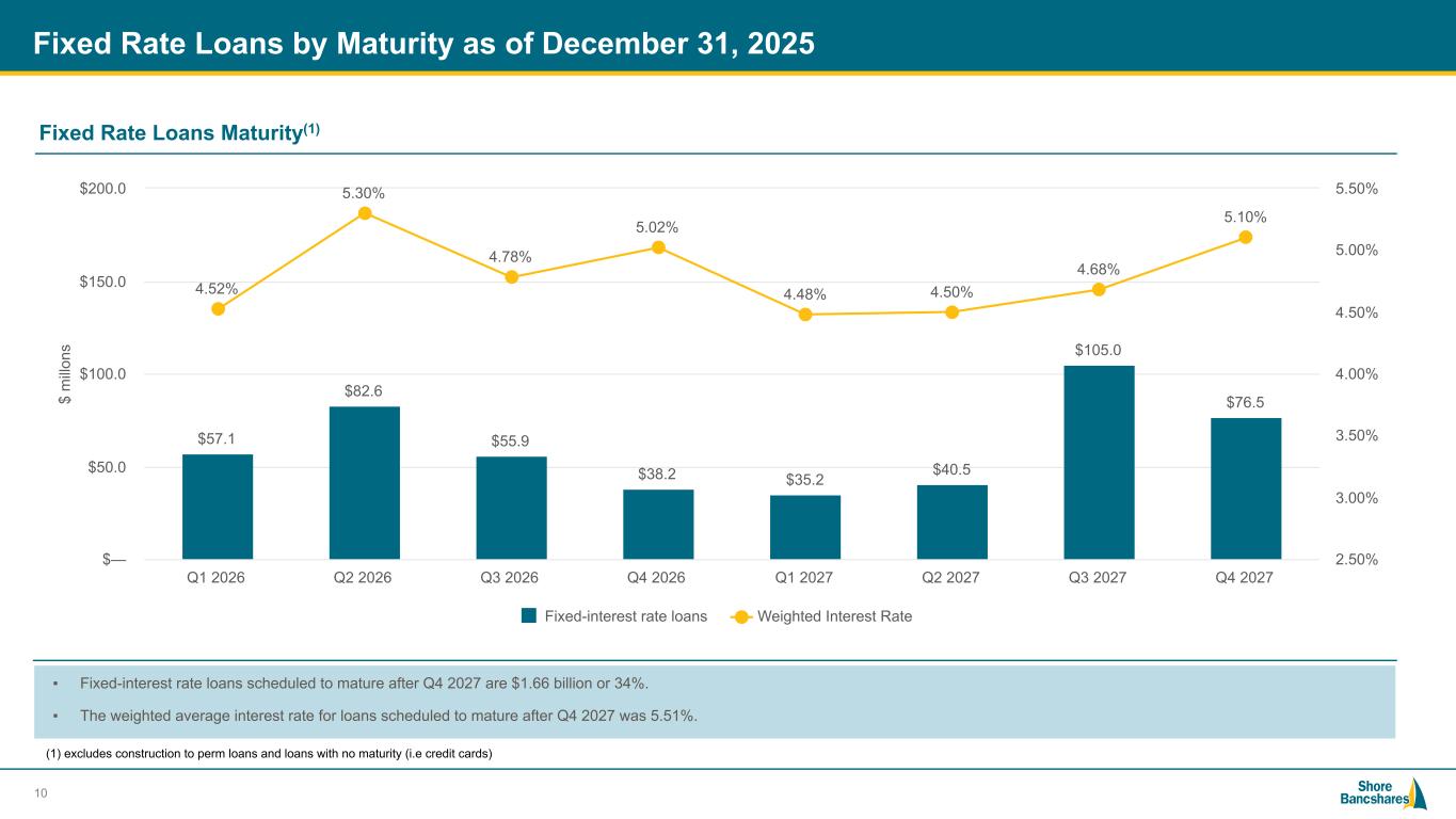 #006881 #ACC0C6 #83AFB4 #FEBE10 #5F574F #4D4F53 #C75B12 #5B8F22 #593160 Commercial real estate 54.0% Residential real estate 28.9% Construction 7.0% Commercial 4.6% Consumer (incl. credit cards) 5.5% Quarterly Loan Trends $4.90B Concentrations as a percentage of total capital as of December 31, 2025: ▪ CRE Concentration Ratio = 342.55% ▪ Construction Concentration Ratio = 54.48% 9 Quarterly Loans ($ in millions) Loan Composition (As of December 31, 2025) Total loans increased $17.3 million driven by growth of AD&C and Commercial Business lines $4,772 $4,777 $4,828 $4,883 $4,900 $2,558 $2,544 $2,604 $2,643 $2,644 $1,329 $1,326 $1,349 $1,383 $1,415 $336 $366 $350 $352 $345 $238 $234 $224 $222 $226$311 $307 $300 $283 $270 Commercial real estate Residential real estate Construction Commercial Consumer Q4 2024 Q1 2025 Q2 2025 Q3 2025 Q4 2025