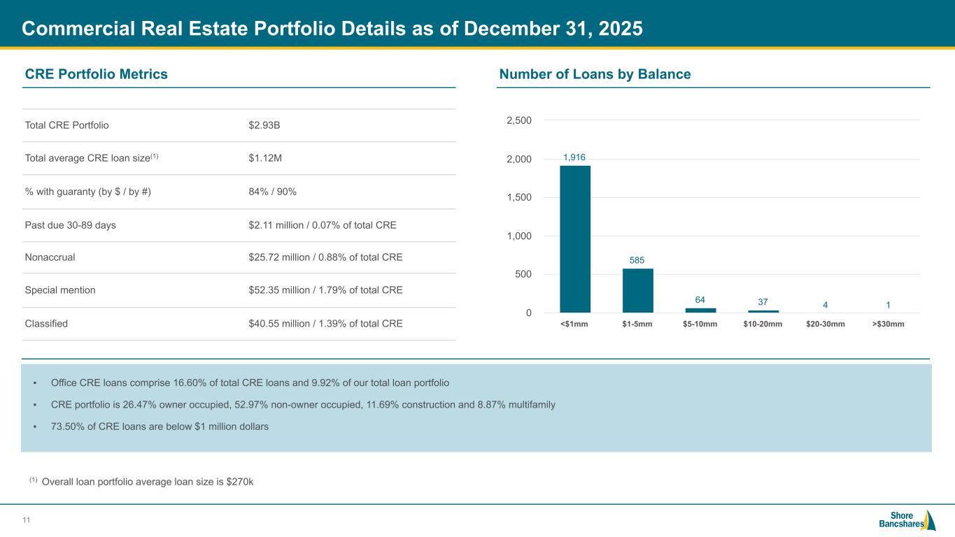 #006881 #ACC0C6 #83AFB4 #FEBE10 #5F574F #4D4F53 #C75B12 #5B8F22 #593160 ▪ Fixed-interest rate loans scheduled to mature after Q4 2027 are $1.66 billion or 34%. ▪ The weighted average interest rate for loans scheduled to mature after Q4 2027 was 5.51%. Fixed Rate Loans by Maturity as of December 31, 2025 10 Fixed Rate Loans Maturity(1) $ m ill on s $57.1 $82.6 $55.9 $38.2 $35.2 $40.5 $105.0 $76.5 4.52% 5.30% 4.78% 5.02% 4.48% 4.50% 4.68% 5.10% Fixed-interest rate loans Weighted Interest Rate Q1 2026 Q2 2026 Q3 2026 Q4 2026 Q1 2027 Q2 2027 Q3 2027 Q4 2027 $— $50.0 $100.0 $150.0 $200.0 2.50% 3.00% 3.50% 4.00% 4.50% 5.00% 5.50% (1) excludes construction to perm loans and loans with no maturity (i.e credit cards)