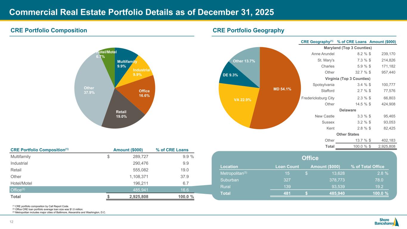 #006881 #ACC0C6 #83AFB4 #FEBE10 #5F574F #4D4F53 #C75B12 #5B8F22 #593160 Commercial Real Estate Portfolio Details as of December 31, 2025 Total CRE Portfolio $2.93B Total average CRE loan size(1) $1.12M % with guaranty (by $ / by #) 84% / 90% Past due 30-89 days $2.11 million / 0.07% of total CRE Nonaccrual $25.72 million / 0.88% of total CRE Special mention $52.35 million / 1.79% of total CRE Classified $40.55 million / 1.39% of total CRE ▪ Office CRE loans comprise 16.60% of total CRE loans and 9.92% of our total loan portfolio ▪ CRE portfolio is 26.47% owner occupied, 52.97% non-owner occupied, 11.69% construction and 8.87% multifamily ▪ 73.50% of CRE loans are below $1 million dollars 11 CRE Portfolio Metrics Number of Loans by Balance 1,916 585 64 37 4 1 <$1mm $1-5mm $5-10mm $10-20mm $20-30mm >$30mm 0 500 1,000 1,500 2,000 2,500 (1) Overall loan portfolio average loan size is $270k