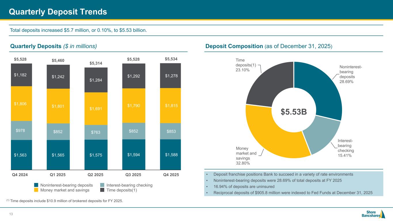 #006881 #ACC0C6 #83AFB4 #FEBE10 #5F574F #4D4F53 #C75B12 #5B8F22 #593160 Commercial Real Estate Portfolio Details as of December 31, 2025 Multifamily 9.9% Industrial 9.9% Office 16.6% Retail 19.0% Other 37.9% Hotel/Motel 6.7% MD 54.1% VA 22.9% DE 9.3% Other 13.7% CRE Portfolio Composition(1) Amount ($000) % of CRE Loans Multifamily $ 289,727 9.9 % Industrial 290,476 9.9 Retail 555,082 19.0 Other 1,108,371 37.9 Hotel/Motel 196,211 6.7 Office(2) 485,941 16.6 Total $ 2,925,808 100.0 % Location Loan Count Amount ($000) % of Total Office Metropolitan(3) 15 $ 13,628 2.8 % Suburban 327 378,773 78.0 Rural 139 93,539 19.2 Total 481 $ 485,940 100.0 % (1) CRE portfolio composition by Call Report Code. (2) Office CRE loan portfolio average loan size was $1.0 million. (3) Metropolitan includes major cities of Baltimore, Alexandria and Washington, D.C. Office 12 CRE Portfolio Composition CRE Portfolio Geography CRE Geography(1) % of CRE Loans Amount ($000) Maryland (Top 3 Counties) Anne Arundel 8.2 % $ 239,170 St. Mary's 7.3 % $ 214,826 Charles 5.9 % $ 171,182 Other 32.7 % $ 957,440 Virginia (Top 3 Counties) Spotsylvania 3.4 % $ 100,777 Stafford 2.7 % $ 77,576 Fredericksburg City 2.3 % $ 66,803 Other 14.5 % $ 424,908 Delaware New Castle 3.3 % $ 95,465 Sussex 3.2 % $ 93,053 Kent 2.8 % $ 82,425 Other States Other 13.7 % $ 402,183 Total 100.0 % $ 2,925,808