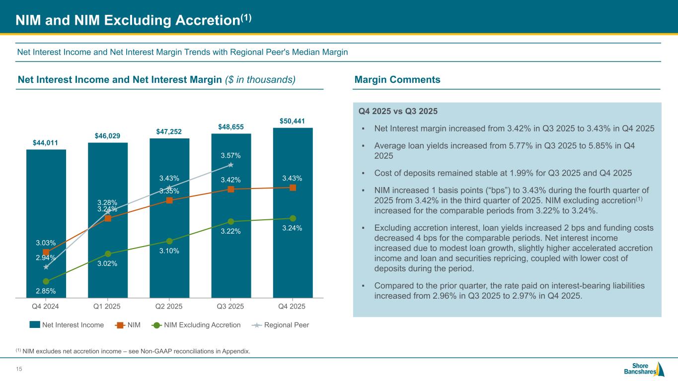 #006881 #ACC0C6 #83AFB4 #FEBE10 #5F574F #4D4F53 #C75B12 #5B8F22 #593160 Investment Portfolio 14 ▪ Allocation: AFS 34%, HTM 65% and equity securities 1% ▪ Effective duration of 3.60 years ▪ Reinvesting 2025 maturing cash flows in stable average life MBS and floating rate bonds ▪ The portfolio exhibits asymmetric sensitivity, with significantly higher exposure to a falling rate environment. In a +200 bps scenario, expected cash flows through 2026 are projected to decline by 7%, while a -200 bps shift drives a substantial 32% increase compared to the base case ▪ MBS securities concentrated in less sensitive prepayment collateral types: low loan balance pools and discounted low coupon pools ▪ $314.5 million or 49% of the portfolio is unencumbered Treasury/Agency 18.4% SBA 1.1% MBS 77.7% Municipal 0.2% Corporate 1.6% CRA Fund Investments 1.0% $641.4M Securities Portfolio Composition at December 31, 2025 Risk Metrics Conservatively constructed to provide liquidity and consistent cash flows in various interest rate scenarios Portfolio Summary ($ in thousands) Book Value Unrealized Gains/ (Losses) Market Value Available for sale $ 226,677 $ (6,319) $ 220,358 Held to maturity 414,926 (36,810) 378,116 Total $ 641,603 $ (43,129) $ 598,474