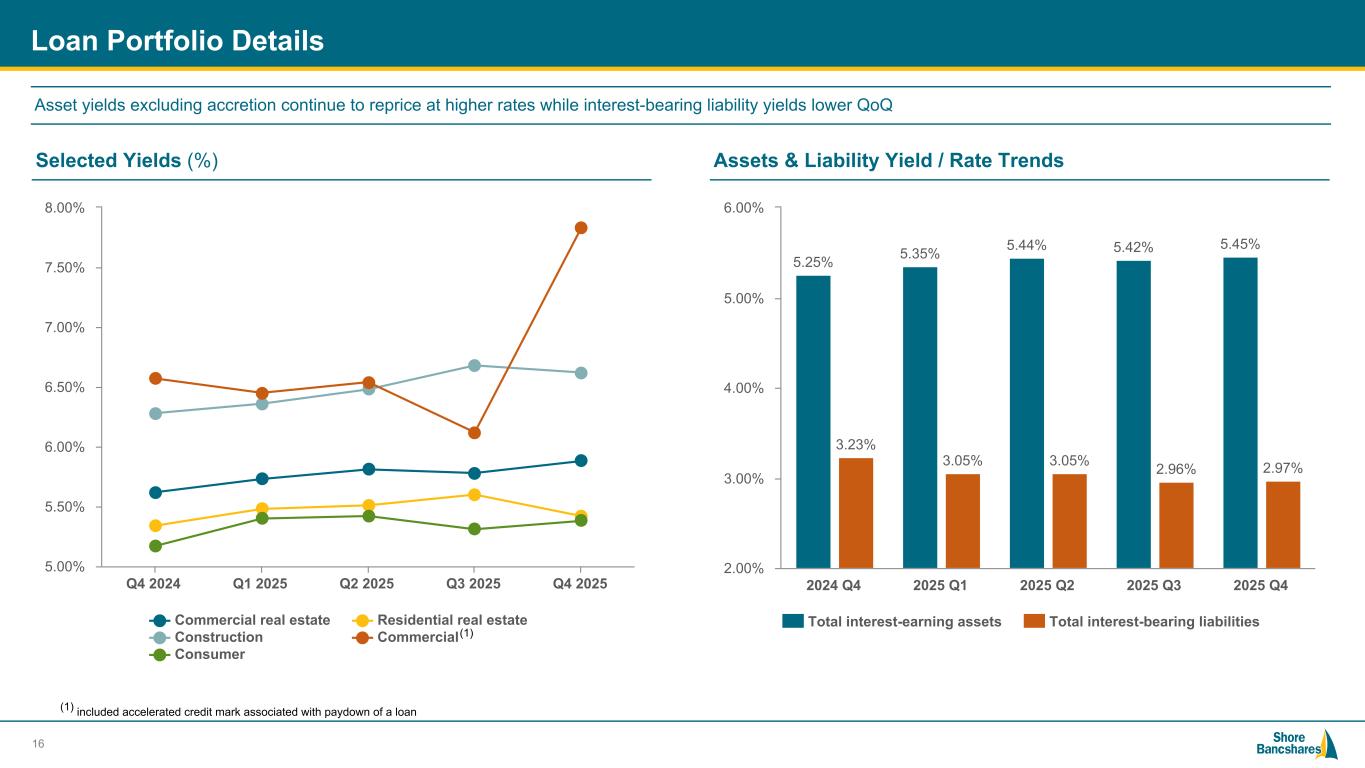 #006881 #ACC0C6 #83AFB4 #FEBE10 #5F574F #4D4F53 #C75B12 #5B8F22 #593160 $44,011 $46,029 $47,252 $48,655 $50,441 3.03% 3.24% 3.35% 3.42% 3.43% 2.85% 3.02% 3.10% 3.22% 3.24% 2.94% 3.28% 3.43% 3.57% Net Interest Income NIM NIM Excluding Accretion Regional Peer Q4 2024 Q1 2025 Q2 2025 Q3 2025 Q4 2025 NIM and NIM Excluding Accretion(1) (1) NIM excludes net accretion income – see Non-GAAP reconciliations in Appendix. 15 Net Interest Income and Net Interest Margin ($ in thousands) Margin Comments Net Interest Income and Net Interest Margin Trends with Regional Peer's Median Margin Q4 2025 vs Q3 2025 ▪ Net Interest margin increased from 3.42% in Q3 2025 to 3.43% in Q4 2025 ▪ Average loan yields increased from 5.77% in Q3 2025 to 5.85% in Q4 2025 ▪ Cost of deposits remained stable at 1.99% for Q3 2025 and Q4 2025 ▪ NIM increased 1 basis points (“bps”) to 3.43% during the fourth quarter of 2025 from 3.42% in the third quarter of 2025. NIM excluding accretion(1) increased for the comparable periods from 3.22% to 3.24%. ▪ Excluding accretion interest, loan yields increased 2 bps and funding costs decreased 4 bps for the comparable periods. Net interest income increased due to modest loan growth, slightly higher accelerated accretion income and loan and securities repricing, coupled with lower cost of deposits during the period. ▪ Compared to the prior quarter, the rate paid on interest-bearing liabilities increased from 2.96% in Q3 2025 to 2.97% in Q4 2025.
