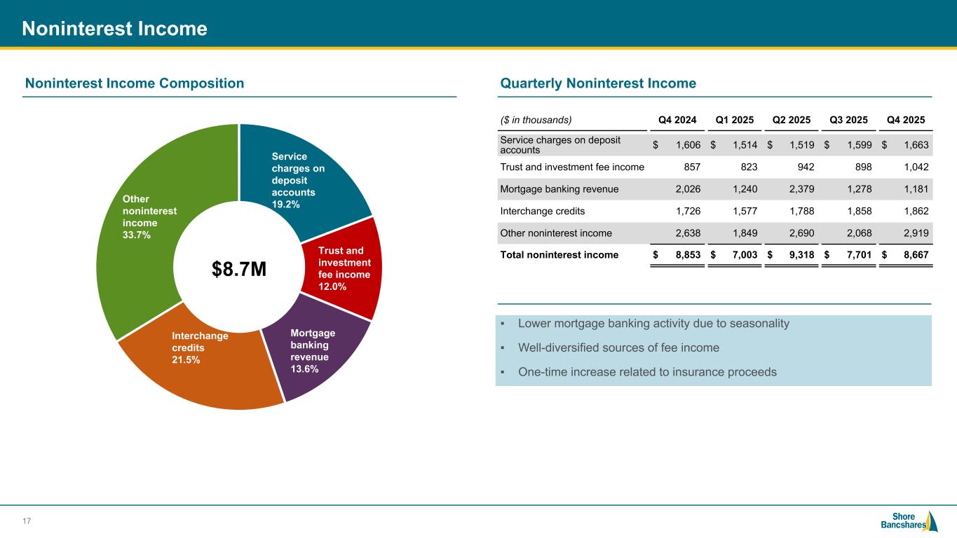 #006881 #ACC0C6 #83AFB4 #FEBE10 #5F574F #4D4F53 #C75B12 #5B8F22 #593160 Loan Portfolio Details Commercial real estate Residential real estate Construction Commercial Consumer Q4 2024 Q1 2025 Q2 2025 Q3 2025 Q4 2025 5.00% 5.50% 6.00% 6.50% 7.00% 7.50% 8.00% 16 Selected Yields (%) 5.25% 5.35% 5.44% 5.42% 5.45% 3.23% 3.05% 3.05% 2.96% 2.97% Total interest-earning assets Total interest-bearing liabilities 2024 Q4 2025 Q1 2025 Q2 2025 Q3 2025 Q4 2.00% 3.00% 4.00% 5.00% 6.00% Assets & Liability Yield / Rate Trends Asset yields excluding accretion continue to reprice at higher rates while interest-bearing liability yields lower QoQ (1) (1) included accelerated credit mark associated with paydown of a loan