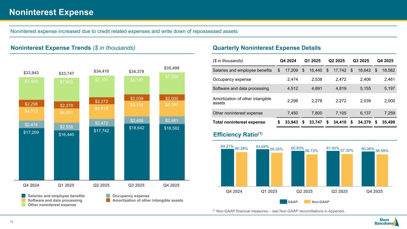 #006881 #ACC0C6 #83AFB4 #FEBE10 #5F574F #4D4F53 #C75B12 #5B8F22 #593160 Noninterest Income 17 Noninterest Income Composition Quarterly Noninterest Income ▪ Lower mortgage banking activity due to seasonality ▪ Well-diversified sources of fee income ▪ One-time increase related to insurance proceeds Service charges on deposit accounts 19.2% Trust and investment fee income 12.0% Mortgage banking revenue 13.6% Interchange credits 21.5% Other noninterest income 33.7% $8.7M ($ in thousands) Q4 2024 Q1 2025 Q2 2025 Q3 2025 Q4 2025 Service charges on deposit accounts $ 1,606 $ 1,514 $ 1,519 $ 1,599 $ 1,663 Trust and investment fee income 857 823 942 898 1,042 Mortgage banking revenue 2,026 1,240 2,379 1,278 1,181 Interchange credits 1,726 1,577 1,788 1,858 1,862 Other noninterest income 2,638 1,849 2,690 2,068 2,919 Total noninterest income $ 8,853 $ 7,003 $ 9,318 $ 7,701 $ 8,667
