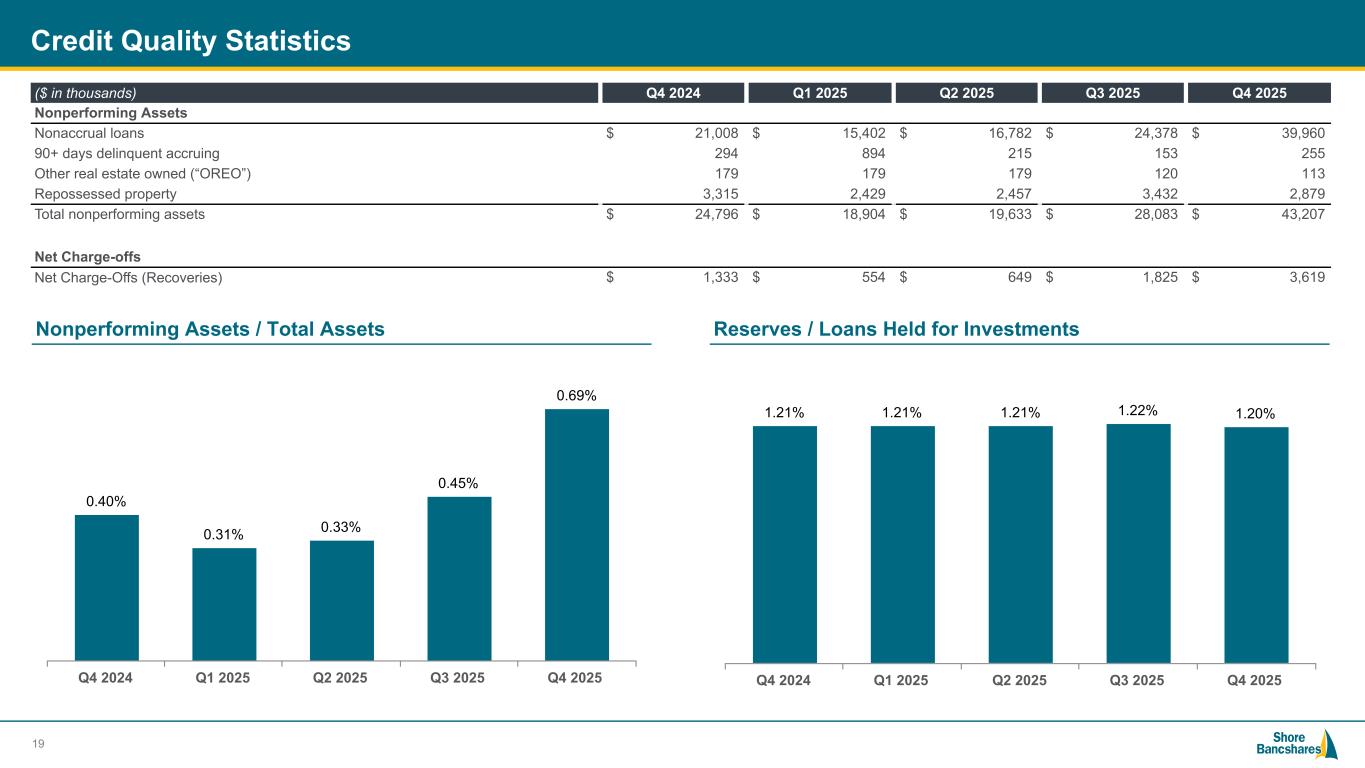 #006881 #ACC0C6 #83AFB4 #FEBE10 #5F574F #4D4F53 #C75B12 #5B8F22 #593160 Noninterest Expense 18 Noninterest Expense Trends ($ in thousands) Quarterly Noninterest Expense Details Noninterest expense increased due to credit related expenses and write down of repossessed assets ($ in thousands) Q4 2024 Q1 2025 Q2 2025 Q3 2025 Q4 2025 Salaries and employee benefits $ 17,209 $ 16,440 $ 17,742 $ 18,642 $ 18,582 Occupancy expense 2,474 2,538 2,472 2,406 2,461 Software and data processing 4,512 4,691 4,819 5,155 5,197 Amortization of other intangible assets 2,298 2,278 2,272 2,039 2,000 Other noninterest expense 7,450 7,800 7,105 6,137 7,259 Total noninterest expense $ 33,943 $ 33,747 $ 34,410 $ 34,379 $ 35,499 Efficiency Ratio(1) $33,943 $33,747 $34,410 $34,379 $35,499 $17,209 $16,440 $17,742 $18,642 $18,582 $2,474 $2,538 $2,472 $2,406 $2,461 $4,512 $4,691 $4,819 $5,155 $5,197$2,298 $2,278 $2,272 $2,039 $2,000 $7,450 $7,800 $7,105 $6,137 $7,259 Salaries and employee benefits Occupancy expense Software and data processing Amortization of other intangible assets Other noninterest expense Q4 2024 Q1 2025 Q2 2025 Q3 2025 Q4 2025 64.21% 63.64% 60.83% 61.00% 60.06%60.28% 59.25% 56.73% 57.30% 56.59% GAAP Non-GAAP Q4 2024 Q1 2025 Q2 2025 Q3 2025 Q4 2025 (1) Non-GAAP financial measures – see Non-GAAP reconciliations in Appendix.