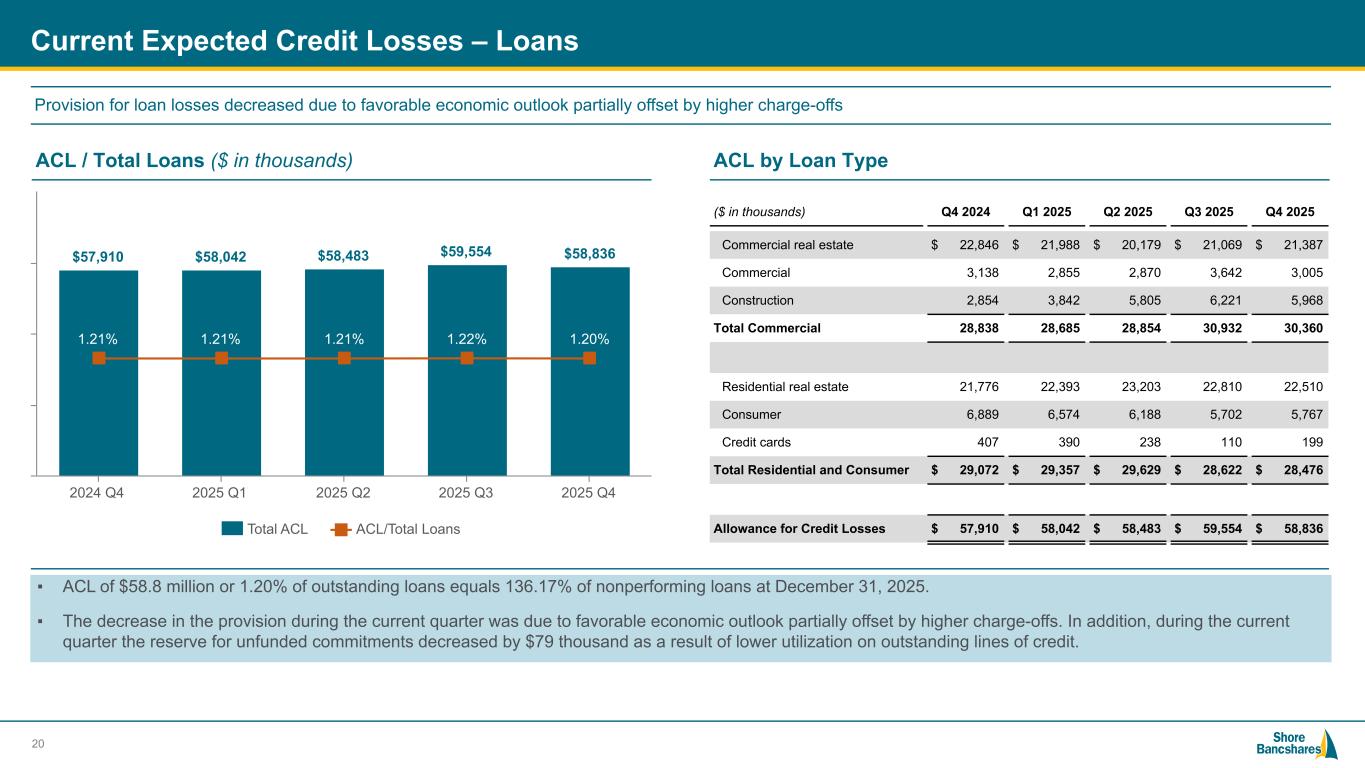 #006881 #ACC0C6 #83AFB4 #FEBE10 #5F574F #4D4F53 #C75B12 #5B8F22 #593160 Credit Quality Statistics ($ in thousands) Q4 2024 Q1 2025 Q2 2025 Q3 2025 Q4 2025 Nonperforming Assets Nonaccrual loans $ 21,008 $ 15,402 $ 16,782 $ 24,378 $ 39,960 90+ days delinquent accruing 294 894 215 153 255 Other real estate owned (“OREO”) 179 179 179 120 113 Repossessed property 3,315 2,429 2,457 3,432 2,879 Total nonperforming assets $ 24,796 $ 18,904 $ 19,633 $ 28,083 $ 43,207 Net Charge-offs Net Charge-Offs (Recoveries) $ 1,333 $ 554 $ 649 $ 1,825 $ 3,619 19 0.40% 0.31% 0.33% 0.45% 0.69% Q4 2024 Q1 2025 Q2 2025 Q3 2025 Q4 2025 1.21% 1.21% 1.21% 1.22% 1.20% Q4 2024 Q1 2025 Q2 2025 Q3 2025 Q4 2025 Nonperforming Assets / Total Assets Reserves / Loans Held for Investments