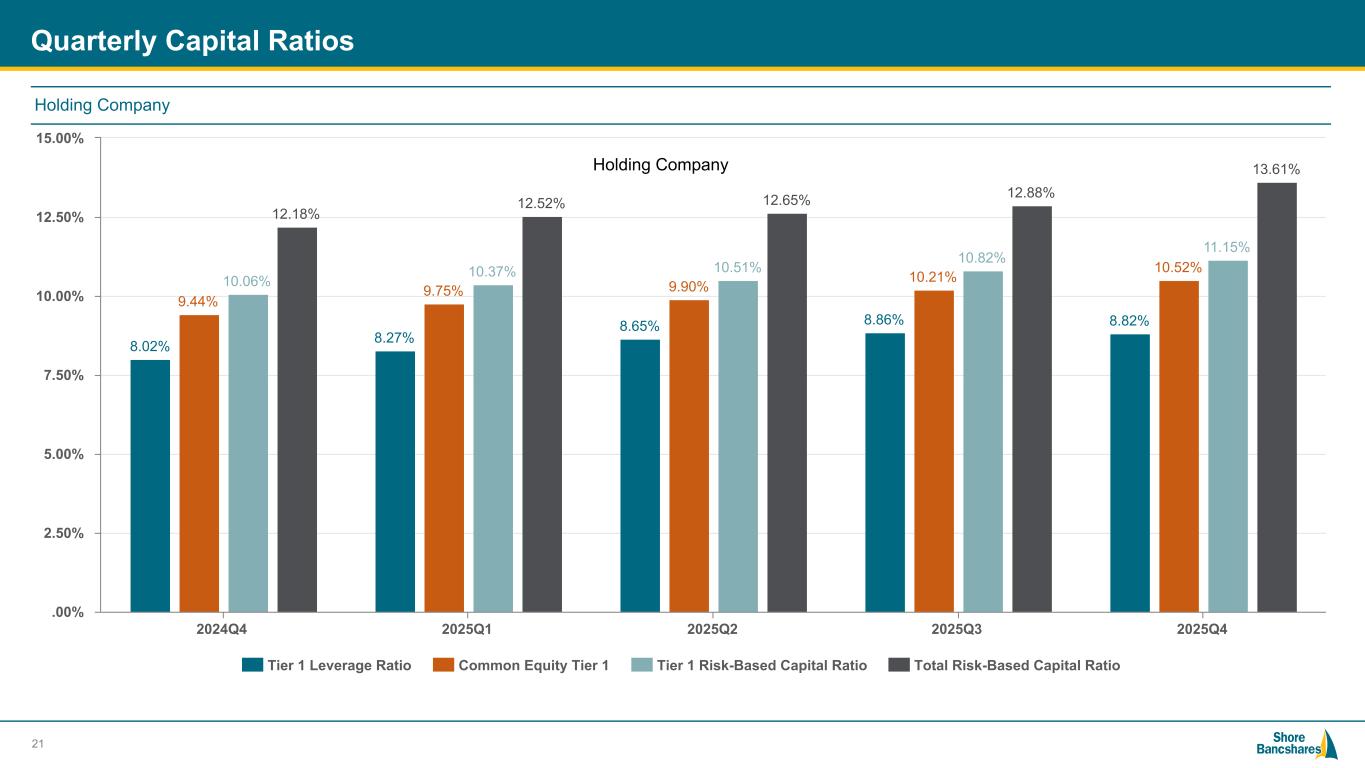 #006881 #ACC0C6 #83AFB4 #FEBE10 #5F574F #4D4F53 #C75B12 #5B8F22 #593160 Quarterly Capital Ratios 8.02% 8.27% 8.65% 8.86% 8.82% 9.44% 9.75% 9.90% 10.21% 10.52% 10.06% 10.37% 10.51% 10.82% 11.15% 12.18% 12.52% 12.65% 12.88% 13.61% Tier 1 Leverage Ratio Common Equity Tier 1 Tier 1 Risk-Based Capital Ratio Total Risk-Based Capital Ratio 2024Q4 2025Q1 2025Q2 2025Q3 2025Q4 .00% 2.50% 5.00% 7.50% 10.00% 12.50% 15.00% 21 Holding Company Holding Company