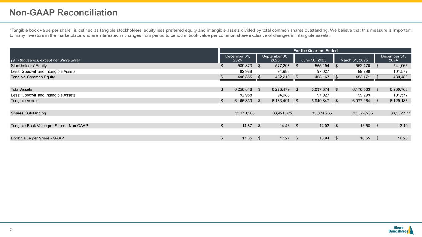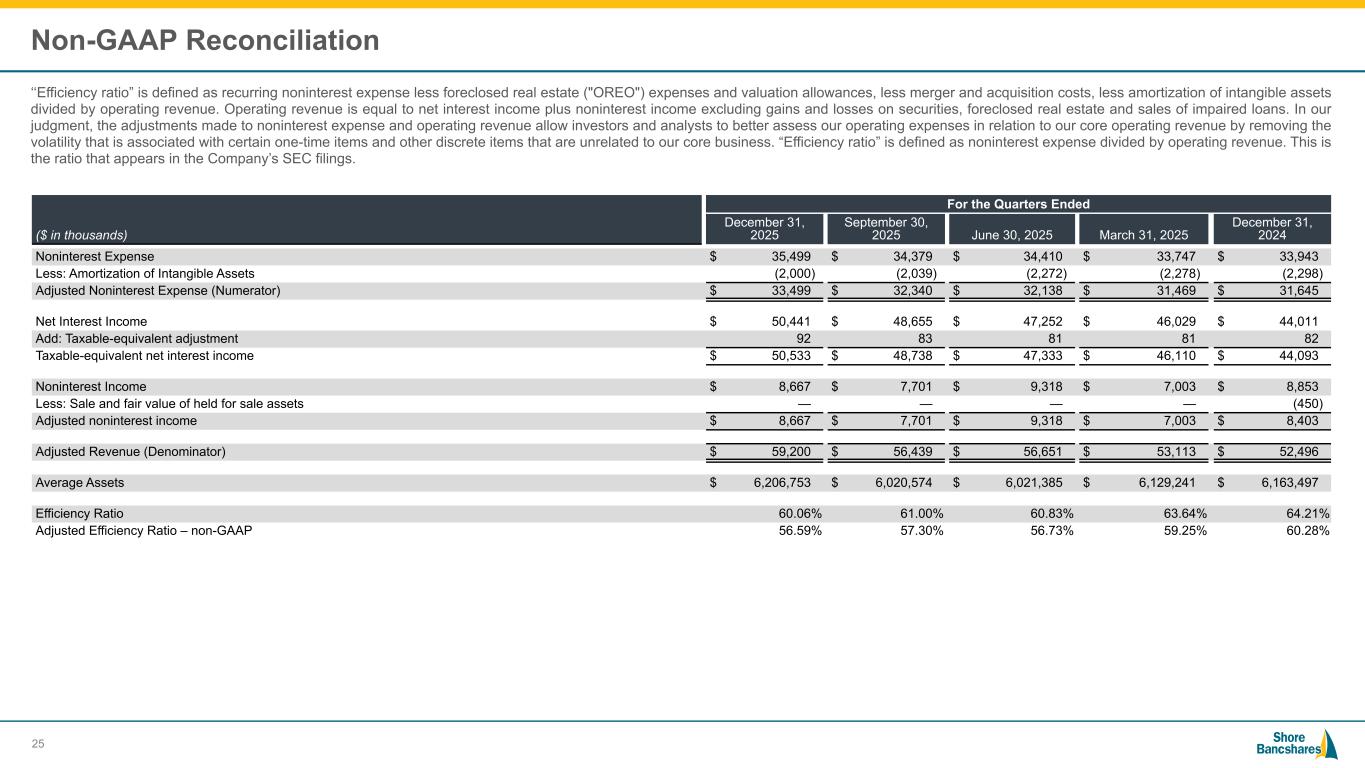 #006881 #ACC0C6 #83AFB4 #FEBE10 #5F574F #4D4F53 #C75B12 #5B8F22 #593160 Non-GAAP Reconciliation ‘‘Tangible book value per share’’ is defined as tangible stockholders’ equity less preferred equity and intangible assets divided by total common shares outstanding. We believe that this measure is important to many investors in the marketplace who are interested in changes from period to period in book value per common share exclusive of changes in intangible assets. ($ in thousands, except per share data) For the Quarters Ended December 31, 2025 September 30, 2025 June 30, 2025 March 31, 2025 December 31, 2024 Stockholders' Equity $ 589,873 $ 577,207 $ 565,194 $ 552,470 $ 541,066 Less: Goodwill and Intangible Assets 92,988 94,988 97,027 99,299 101,577 Tangible Common Equity $ 496,885 $ 482,219 $ 468,167 $ 453,171 $ 439,489 Total Assets $ 6,258,818 $ 6,278,479 $ 6,037,874 $ 6,176,563 $ 6,230,763 Less: Goodwill and Intangible Assets 92,988 94,988 97,027 99,299 101,577 Tangible Assets $ 6,165,830 $ 6,183,491 $ 5,940,847 $ 6,077,264 $ 6,129,186 Shares Outstanding 33,413,503 33,421,672 33,374,265 33,374,265 33,332,177 Tangible Book Value per Share - Non GAAP $ 14.87 $ 14.43 $ 14.03 $ 13.58 $ 13.19 Book Value per Share - GAAP $ 17.65 $ 17.27 $ 16.94 $ 16.55 $ 16.23 24