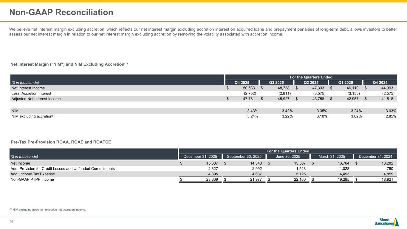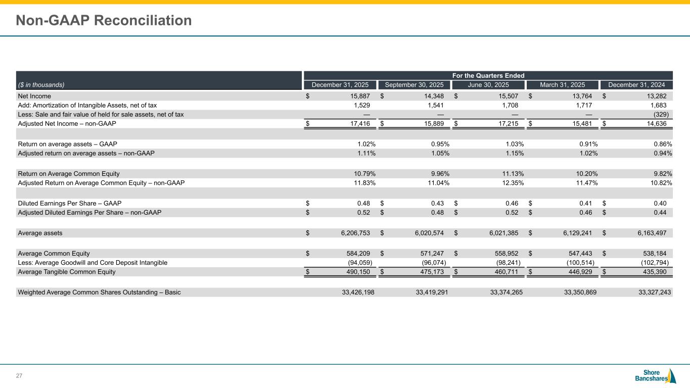 #006881 #ACC0C6 #83AFB4 #FEBE10 #5F574F #4D4F53 #C75B12 #5B8F22 #593160 Non-GAAP Reconciliation We believe net interest margin excluding accretion, which reflects our net interest margin excluding accretion interest on acquired loans and prepayment penalties of long-term debt, allows investors to better assess our net interest margin in relation to our net interest margin excluding accretion by removing the volatility associated with accretion income. Net Interest Margin ("NIM") and NIM Excluding Accretion(1) ($ in thousands) For the Quarters Ended Q4 2025 Q3 2025 Q2 2025 Q1 2025 Q4 2024 Net Interest Income $ 50,533 $ 48,738 $ 47,333 $ 46,110 $ 44,093 Less: Accretion Interest (2,752) (2,811) (3,575) (3,153) (2,575) Adjusted Net Interest Income $ 47,781 $ 45,927 $ 43,758 $ 42,957 $ 41,518 NIM 3.43 % 3.42 % 3.35 % 3.24 % 3.03 % NIM excluding accretion(1) 3.24 % 3.22 % 3.10 % 3.02 % 2.85 % (1) NIM excluding accretion excludes net accretion income. 26 Pre-Tax Pre-Provision ROAA, ROAE and ROATCE ($ in thousands) For the Quarters Ended December 31, 2025 September 30, 2025 June 30, 2025 March 31, 2025 December 31, 2024 Net Income $ 15,887 $ 14,348 $ 15,507 $ 13,764 $ 13,282 Add: Provision for Credit Losses and Unfunded Commitments 2,827 2,992 1,528 1,028 780 Add: Income Tax Expense 4,895 4,637 5,125 4,493 4,859 Non-GAAP PTPP Income $ 23,609 $ 21,977 $ 22,160 $ 19,285 $ 18,921