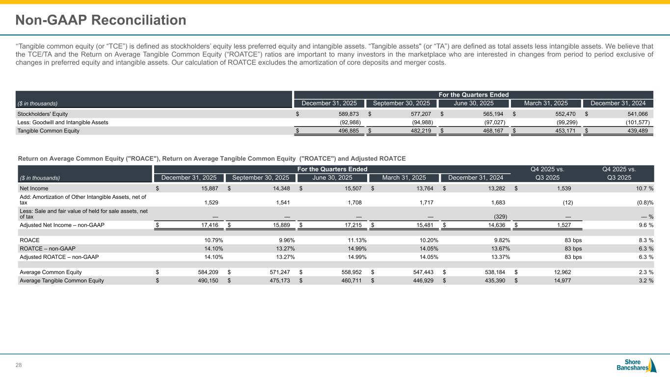 #006881 #ACC0C6 #83AFB4 #FEBE10 #5F574F #4D4F53 #C75B12 #5B8F22 #593160 Non-GAAP Reconciliation ‘‘Tangible common equity (or “TCE”) is defined as stockholders’ equity less preferred equity and intangible assets. “Tangible assets" (or “TA”) are defined as total assets less intangible assets. We believe that the TCE/TA and the Return on Average Tangible Common Equity (“ROATCE”) ratios are important to many investors in the marketplace who are interested in changes from period to period exclusive of changes in preferred equity and intangible assets. Our calculation of ROATCE excludes the amortization of core deposits and merger costs. Return on Average Common Equity ("ROACE"), Return on Average Tangible Common Equity ("ROATCE") and Adjusted ROATCE ($ in thousands) For the Quarters Ended December 31, 2025 September 30, 2025 June 30, 2025 March 31, 2025 December 31, 2024 Stockholders' Equity $ 589,873 $ 577,207 $ 565,194 $ 552,470 $ 541,066 Less: Goodwill and Intangible Assets (92,988) (94,988) (97,027) (99,299) (101,577) Tangible Common Equity $ 496,885 $ 482,219 $ 468,167 $ 453,171 $ 439,489 ($ in thousands) For the Quarters Ended Q4 2025 vs. Q4 2025 vs. December 31, 2025 September 30, 2025 June 30, 2025 March 31, 2025 December 31, 2024 Q3 2025 Q3 2025 Net Income $ 15,887 $ 14,348 $ 15,507 $ 13,764 $ 13,282 $ 1,539 10.7 % Add: Amortization of Other Intangible Assets, net of tax 1,529 1,541 1,708 1,717 1,683 (12) (0.8) % Less: Sale and fair value of held for sale assets, net of tax — — — — (329) — — % Adjusted Net Income – non-GAAP $ 17,416 $ 15,889 $ 17,215 $ 15,481 $ 14,636 $ 1,527 9.6 % ROACE 10.79 % 9.96 % 11.13 % 10.20 % 9.82 % 83 bps 8.3 % ROATCE – non-GAAP 14.10 % 13.27 % 14.99 % 14.05 % 13.67 % 83 bps 6.3 % Adjusted ROATCE – non-GAAP 14.10 % 13.27 % 14.99 % 14.05 % 13.37 % 83 bps 6.3 % Average Common Equity $ 584,209 $ 571,247 $ 558,952 $ 547,443 $ 538,184 $ 12,962 2.3 % Average Tangible Common Equity $ 490,150 $ 475,173 $ 460,711 $ 446,929 $ 435,390 $ 14,977 3.2 % 28