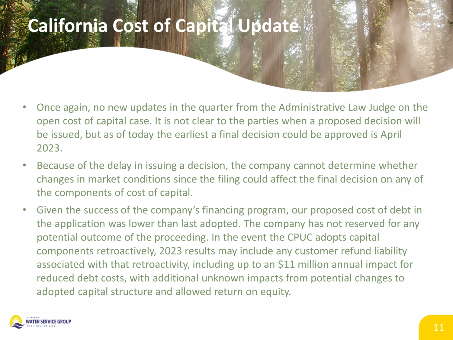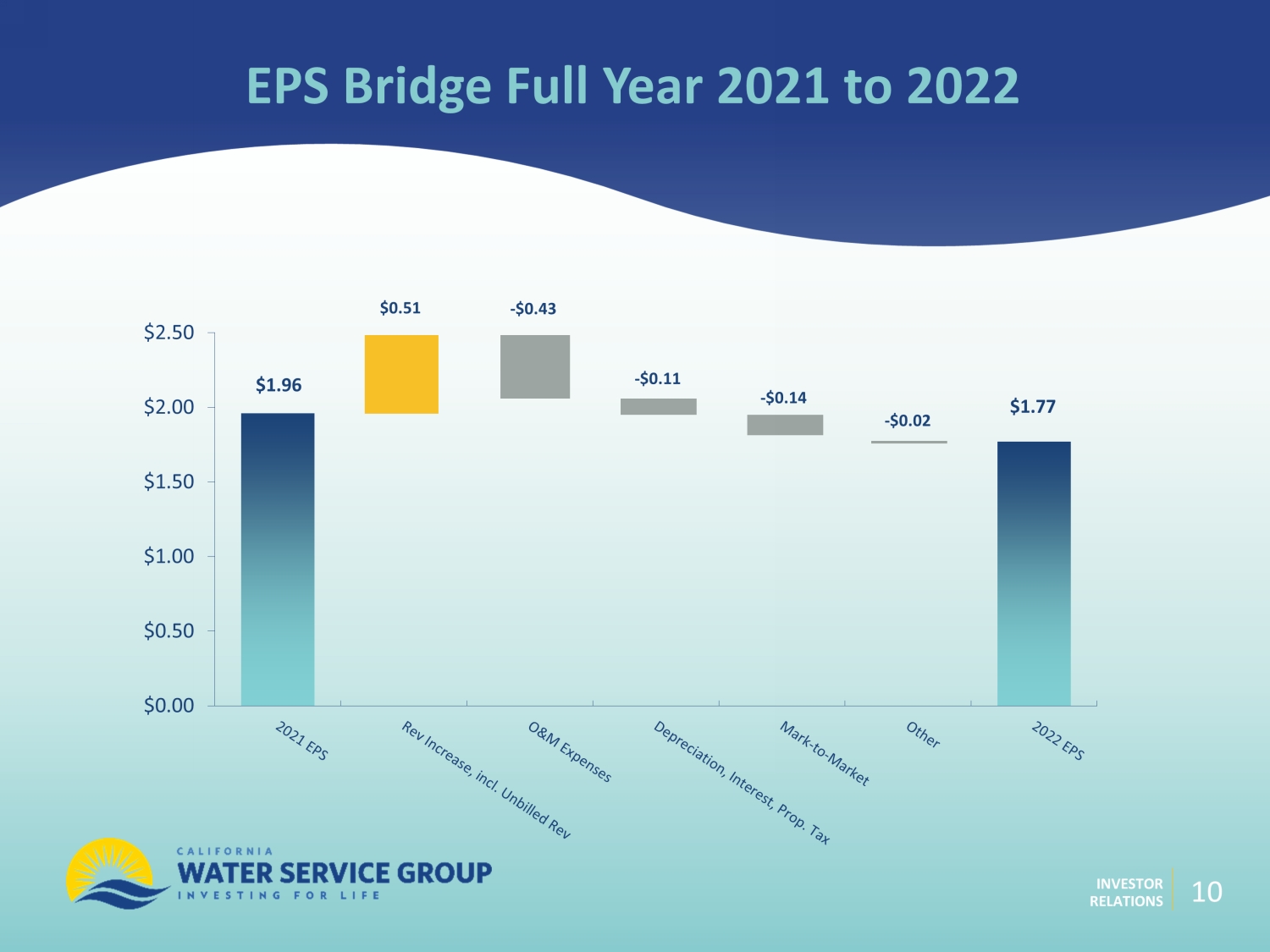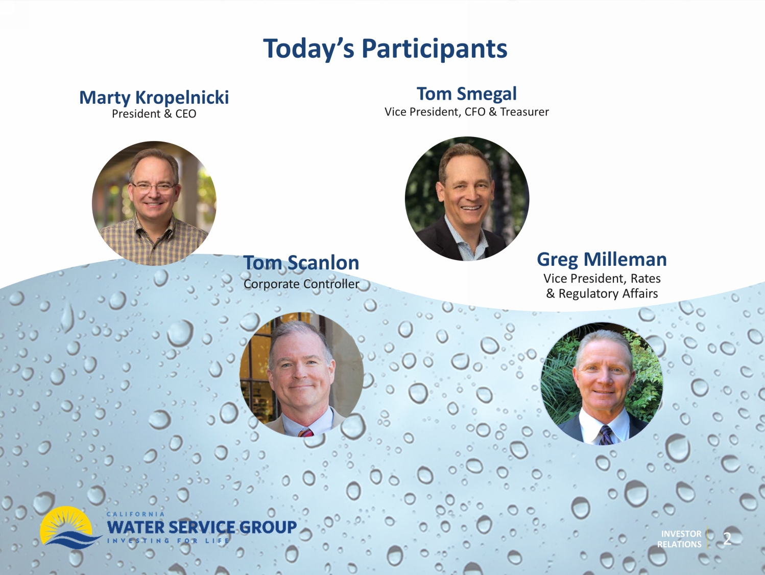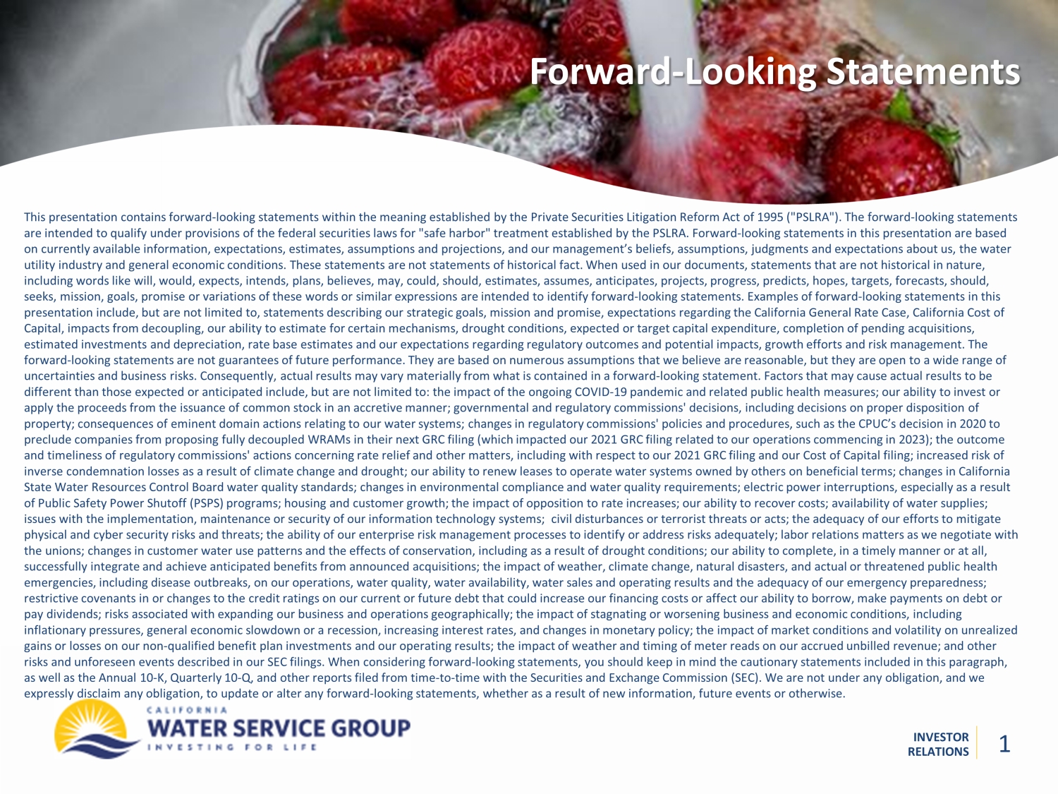 INVESTOR RELATIONS Forward - Looking Statements This presentation contains forward - looking statements within the meaning established by the Private Securities Litigation Reform Act of 1995 ("PSLRA"). The forward - looking statements are intended to qualify under provisions of the federal securities laws for "safe harbor" treatment established by the PSLRA. Fo rward - looking statements in this presentation are based on currently available information, expectations, estimates, assumptions and projections, and our management’s beliefs, assum pti ons, judgments and expectations about us, the water utility industry and general economic conditions. These statements are not statements of historical fact. When used in our do cum ents, statements that are not historical in nature, including words like will, would, expects, intends, plans, believes, may, could, should, estimates, assumes, anticipates, pro jec ts, progress, predicts, hopes, targets, forecasts, should, seeks, mission, goals, promise or variations of these words or similar expressions are intended to identify forward - looking stat ements. Examples of forward - looking statements in this presentation include, but are not limited to, statements describing our strategic goals, mission and promise, expectations re gar ding the California General Rate Case, California Cost of Capital, impacts from decoupling, our ability to estimate for certain mechanisms, drought conditions, expected or target capi tal expenditure, completion of pending acquisitions, estimated investments and depreciation, rate base estimates and our expectations regarding regulatory outcomes and potential imp acts, growth efforts and risk management. The forward - looking statements are not guarantees of future performance. They are based on numerous assumptions that we believe are reasonable, but they are open to a wide range of uncertainties and business risks. Consequently, actual results may vary materially from what is contained in a forward - looking s tatement. Factors that may cause actual results to be different than those expected or anticipated include, but are not limited to: the impact of the ongoing COVID - 19 pandemic and re lated public health measures; our ability to invest or apply the proceeds from the issuance of common stock in an accretive manner; governmental and regulatory commissions' decisio ns, including decisions on proper disposition of property; consequences of eminent domain actions relating to our water systems; changes in regulatory commissions' policies a nd procedures, such as the CPUC’s decision in 2020 to preclude companies from proposing fully decoupled WRAMs in their next GRC filing (which impacted our 2021 GRC filing related to our operations commencing in 2023); the outcome and timeliness of regulatory commissions' actions concerning rate relief and other matters, including with respect to our 202 1 G RC filing and our Cost of Capital filing; increased risk of inverse condemnation losses as a result of climate change and drought; our ability to renew leases to operate water systems o wne d by others on beneficial terms; changes in California State Water Resources Control Board water quality standards; changes in environmental compliance and water quality requiremen ts; electric power interruptions, especially as a result of Public Safety Power Shutoff (PSPS) programs; housing and customer growth; the impact of opposition to rate increases; our abi lity to recover costs; availability of water supplies; issues with the implementation, maintenance or security of our information technology systems; civil disturbances or terrori st threats or acts; the adequacy of our efforts to mitigate physical and cyber security risks and threats; the ability of our enterprise risk management processes to identify or address ri sks adequately; labor relations matters as we negotiate with the unions; changes in customer water use patterns and the effects of conservation, including as a result of drought conditio ns; our ability to complete, in a timely manner or at all, successfully integrate and achieve anticipated benefits from announced acquisitions; the impact of weather, climate change, n atu ral disasters, and actual or threatened public health emergencies, including disease outbreaks, on our operations, water quality, water availability, water sales and operating res ult s and the adequacy of our emergency preparedness; restrictive covenants in or changes to the credit ratings on our current or future debt that could increase our financing cos ts or affect our ability to borrow, make payments on debt or pay dividends; risks associated with expanding our business and operations geographically; the impact of stagnating or worsen ing business and economic conditions, including inflationary pressures, general economic slowdown or a recession, increasing interest rates, and changes in monetary policy; the impact of market conditions and volatility on unrealized gains or losses on our non - qualified benefit plan investments and our operating results; the impact of weather and timing of met er reads on our accrued unbilled revenue; and other risks and unforeseen events described in our SEC filings. When considering forward - looking statements, you should keep in mind t he cautionary statements included in this paragraph, as well as the Annual 10 - K, Quarterly 10 - Q, and other reports filed from time - to - time with the Securities and Exchange Commissio n (SEC). We are not under any obligation, and we expressly disclaim any obligation, to update or alter any forward - looking statements, whether as a result of new information, fu ture events or otherwise . 1