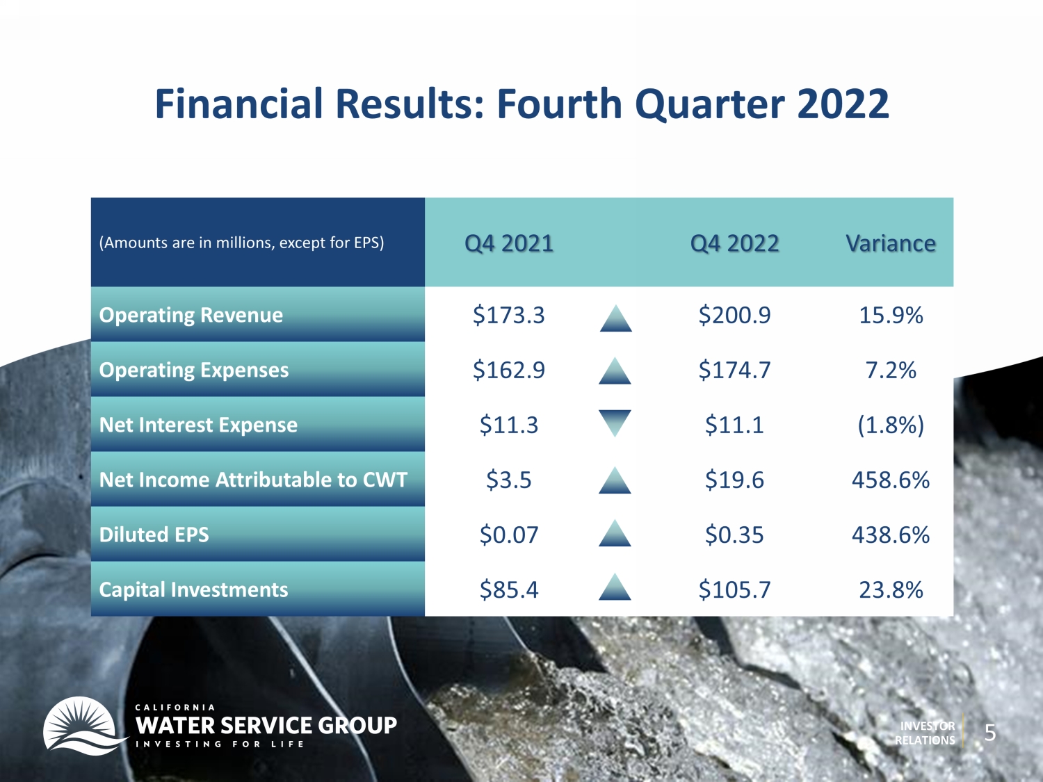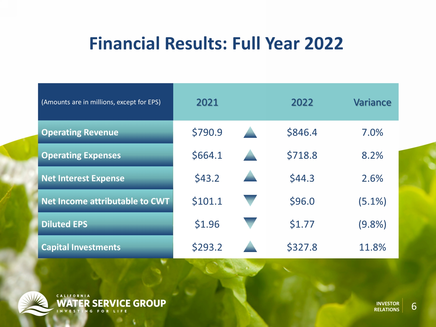 INVESTOR RELATIONS Financial Results: Full Year 2022 (Amounts are in millions, except for EPS) 2021 2022 Variance Operating Revenue $790.9 $846.4 7.0% Operating Expenses $664.1 $718.8 8.2% Net Interest Expense $43.2 $44.3 2.6% Net In come attributable to CWT $101.1 $96.0 (5.1%) Diluted EPS $1.96 $1.77 (9.8%) Capital Investments $293.2 $327.8 11.8% 6