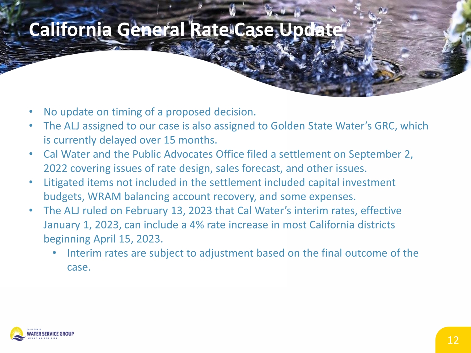 California Cost of Capital Update • Once again, no new updates in the quarter from the Administrative Law Judge on the open cost of capital case. It is not clear to the parties when a proposed decision will be issued, but as of today the earliest a final decision could be approved is April 2023. • Because of the delay in issuing a decision, the company cannot determine whether changes in market conditions since the filing could affect the final decision on any of the components of cost of capital. • Given the success of the company’s financing program, our proposed cost of debt in the application was lower than last adopted. The company has not reserved for any potential outcome of the proceeding. In the event the CPUC adopts capital components retroactively, 2023 results may include any customer refund liability associated with that retroactivity, including up to an $11 million annual impact for reduced debt costs, with additional unknown impacts from potential changes to adopted capital structure and allowed return on equity. 11