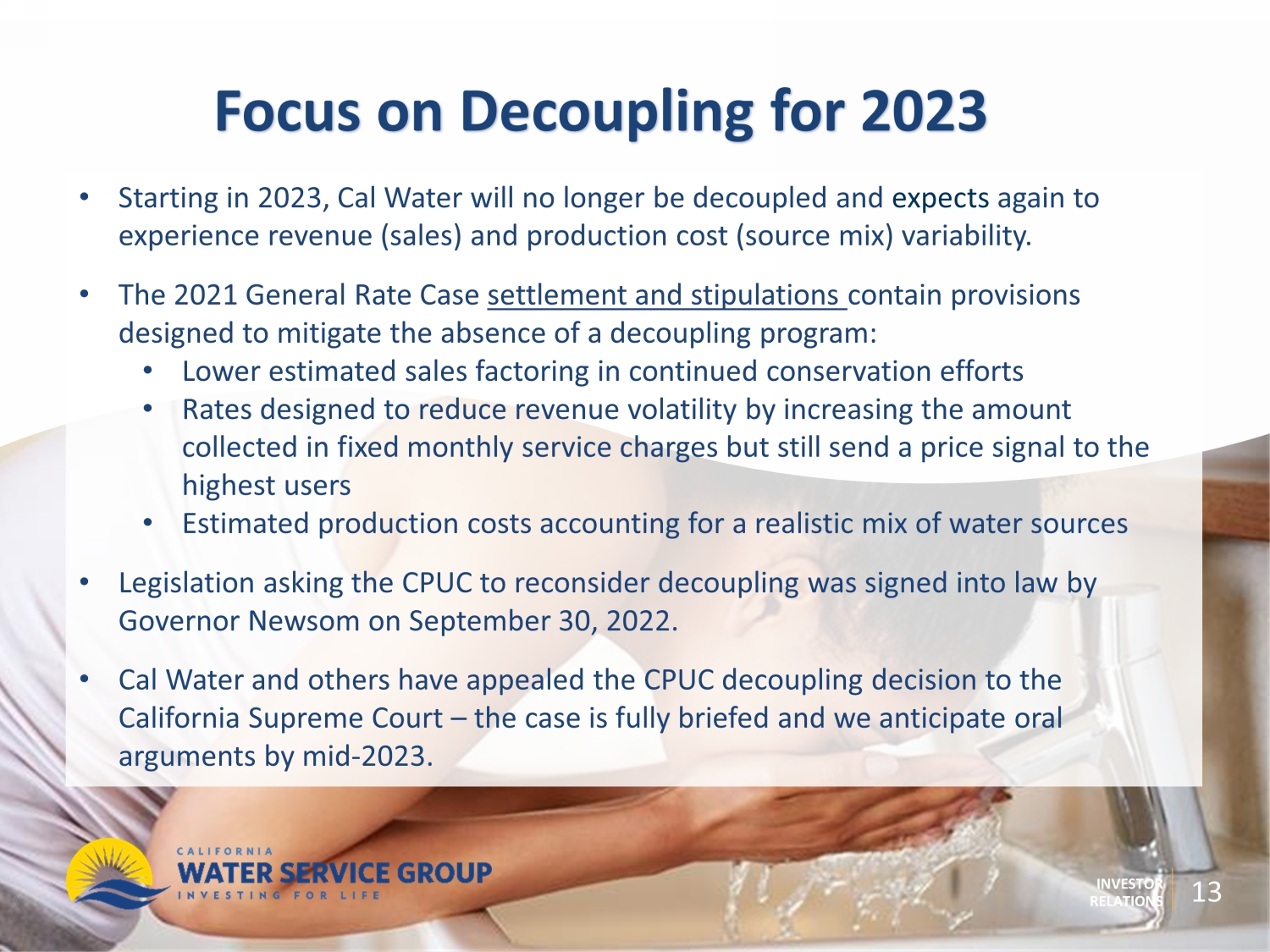 California General Rate Case Update • No update on timing of a proposed decision. • The ALJ assigned to our case is also assigned to Golden State Water’s GRC, which is currently delayed over 15 months. • Cal Water and the Public Advocates Office filed a settlement on September 2, 2022 covering issues of rate design, sales forecast, and other issues. • Litigated items not included in the settlement included capital investment budgets, WRAM balancing account recovery, and some expenses. • The ALJ ruled on February 13, 2023 that Cal Water’s interim rates, effective January 1, 2023, can include a 4% rate increase in most California districts beginning April 15, 2023. • Interim rates are subject to adjustment based on the final outcome of the case. 12