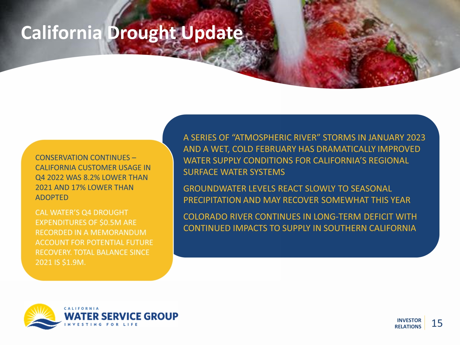 INVESTOR RELATIONS CA Tracker Status for 2023 • Mechanisms we should be able to estimate prior to a GRC decision: • Incremental Cost Balancing Account (ICBA) covers changes in unit prices for production costs. • Conservation Balancing Account covers conservation expenses • Mechanisms which are in effect, but which we will not be able to estimate due to uncertainty of the GRC adopted revenue requirement: • Drought Lost Revenue Account tracks lost sales revenue due to the drought • Interim Rate Memorandum account tracks the difference between interim rates and final rates adopted in the GRC • Unopposed mechanisms , but which we do not currently have enough information to estimate: • Monterey - style revenue adjustment mechanism would track differential effect of tiered pricing on changes in water sales • 2023 - 2025 Health Care Balancing account (HCBA) covers changes in medical costs • 2023 - 2025 Pension Balancing Account would track changes in pension costs 14