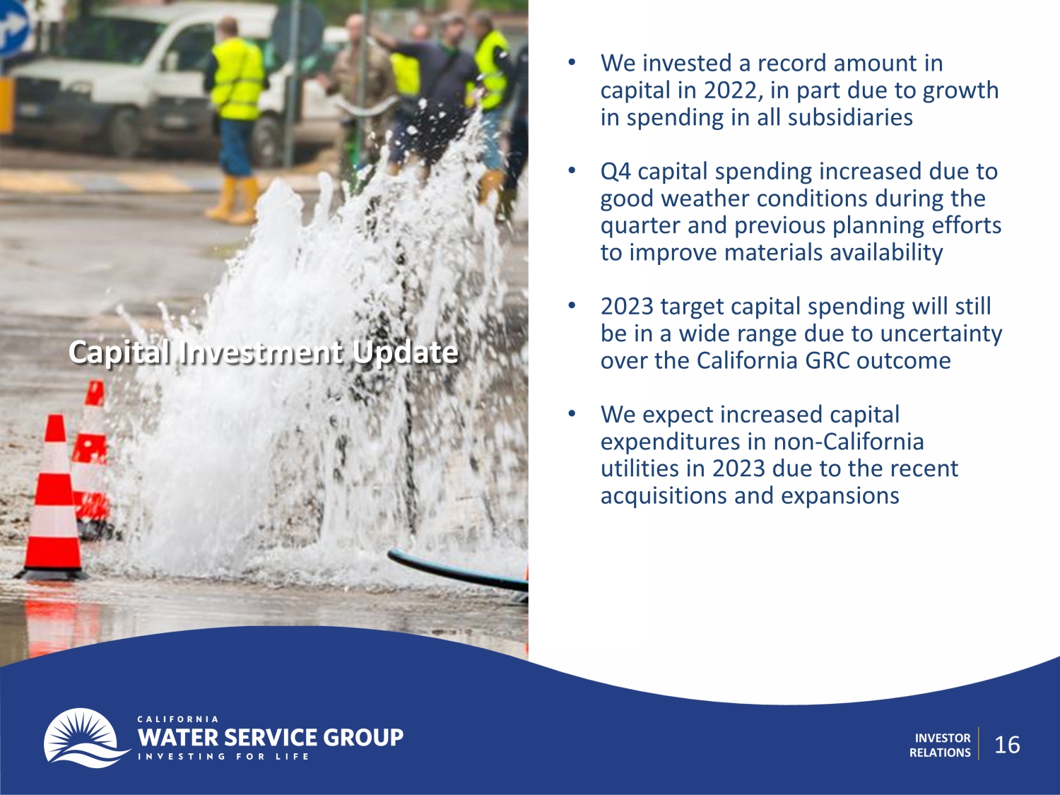 INVESTOR RELATIONS A SERIES OF “ATMOSPHERIC RIVER” STORMS IN JANUARY 2023 AND A WET, COLD FEBRUARY HAS DRAMATICALLY IMPROVED WATER SUPPLY CONDITIONS FOR CALIFORNIA’S REGIONAL SURFACE WATER SYSTEMS GROUNDWATER LEVELS REACT SLOWLY TO SEASONAL PRECIPITATION AND MAY RECOVER SOMEWHAT THIS YEAR COLORADO RIVER CONTINUES IN LONG - TERM DEFICIT WITH CONTINUED IMPACTS TO SUPPLY IN SOUTHERN CALIFORNIA CONSERVATION CONTINUES – CALIFORNIA CUSTOMER USAGE IN Q4 2022 WAS 8.2% LOWER THAN 2021 AND 17% LOWER THAN ADOPTED CAL WATER’S Q4 DROUGHT EXPENDITURES OF $0.5M ARE RECORDED IN A MEMORANDUM ACCOUNT FOR POTENTIAL FUTURE RECOVERY. TOTAL BALANCE SINCE 2021 IS $1.9M. California Drought Update 15