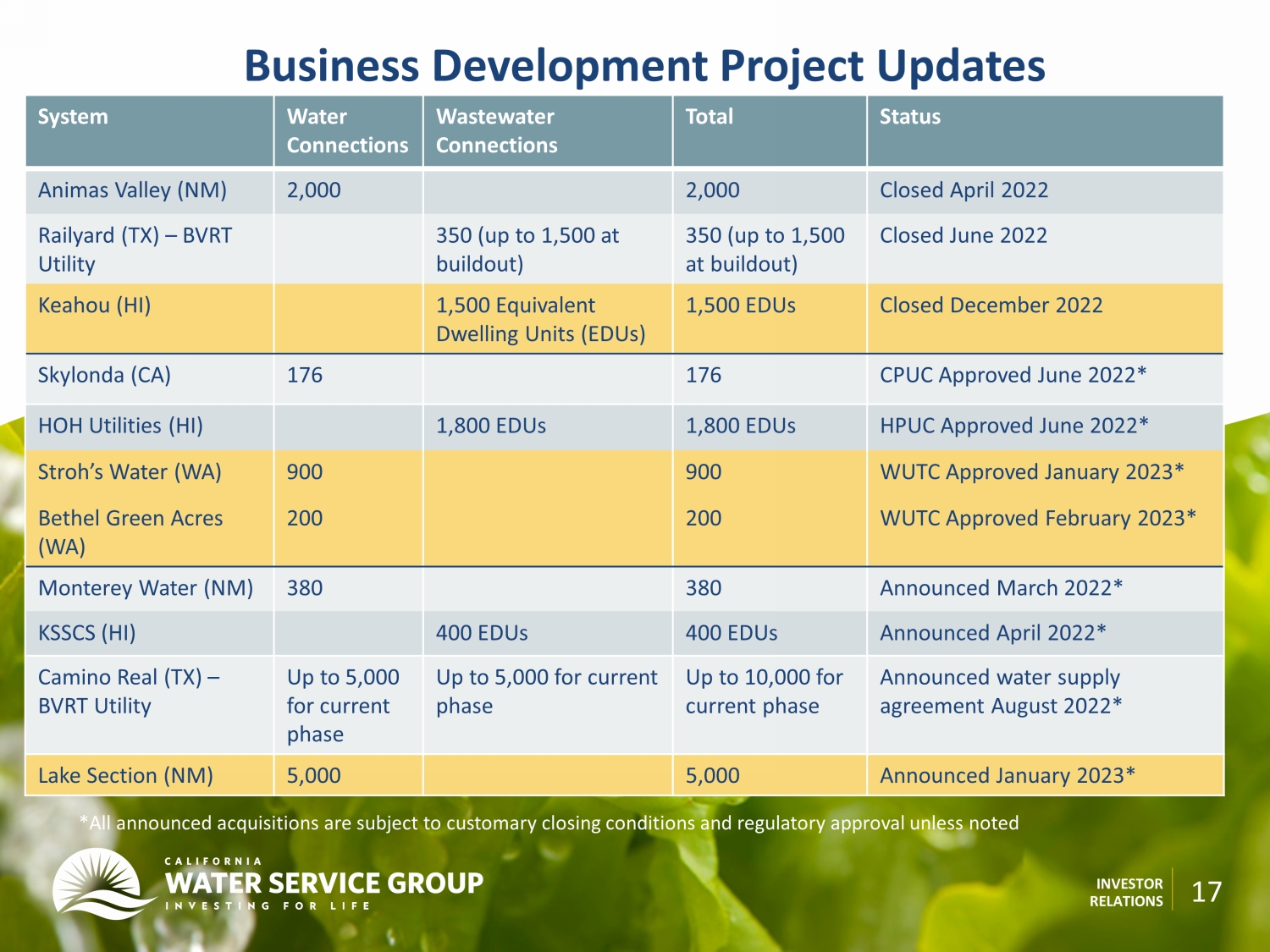 INVESTOR RELATIONS Business Development Project Updates System Water Connections Wastewater Connections Total Status Animas Valley (NM) 2,000 2,000 Closed April 2022 Railyard (TX) – BVRT Utility 350 (up to 1,500 at buildout) 350 (up to 1,500 at buildout) Closed June 2022 Keahou (HI) 1,500 Equivalent Dwelling Units (EDUs) 1,500 EDUs Closed December 2022 Skylonda (CA) 176 176 CPUC Approved June 2022* HOH Utilities (HI) 1,800 EDUs 1,800 EDUs HPUC Approved June 2022 * Stroh’s Water (WA) 900 900 WUTC Approved January 2023* Bethel Green Acres (WA) 200 200 WUTC Approved February 2023* Monterey Water (NM) 380 380 Announced March 2022* KSSCS (HI) 400 EDUs 400 EDUs Announced April 2022* Camino Real (TX) – BVRT Utility Up to 5,000 for current phase Up to 5,000 for current phase Up to 10,000 for current phase Announced water supply agreement August 2022* Lake Section (NM) 5,000 5,000 Announced January 2023* *All announced acquisitions are subject to customary closing conditions and regulatory approval unless noted 17