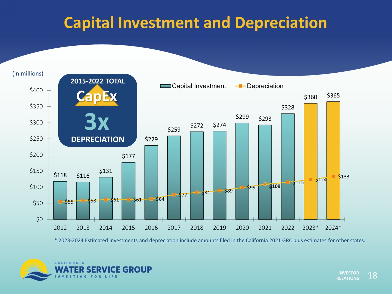 INVESTOR RELATIONS $118 $116 $131 $177 $229 $259 $272 $274 $299 $293 $328 $360 $365 $55 $58 $61 $61 $64 $77 $84 $89 $99 $115 $124 $133 $0 $50 $100 $150 $200 $250 $300 $350 $400 2012 2013 2014 2015 2016 2017 2018 2019 2020 2021 2022 2023* 2024* Capital Investment Depreciation Capital Investment and Depreciation (in millions) * 2023 - 2024 Estimated investments and depreciation include amounts filed in the California 2021 GRC plus estimates for other sta tes. 2008 - 2019 CAGR 9.7% 2015 - 2022 TOTAL CapEx 3x DEPRECIATION $109 18