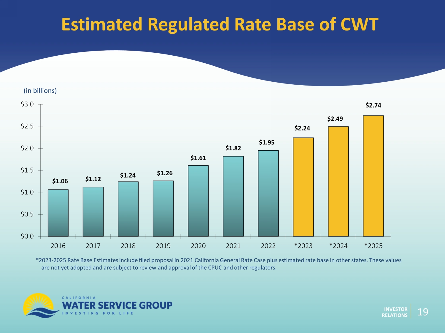 INVESTOR RELATIONS Estimated Regulated Rate Base of CWT (in billions ) *2023 - 2025 Rate Base Estimates include filed proposal in 2021 California General Rate Case plus estimated rate base in other sta tes. These values are not yet adopted and are subject to review and approval of the CPUC and other regulators. $1.06 $1.12 $1.24 $1.61 $2.74 $1.26 $ 1.82 $0.0 $0.5 $1.0 $1.5 $2.0 $2.5 $3.0 2016 2017 2018 2019 2020 2021 2022 *2023 *2024 *2025 $1.95 $2.24 $2.49 19
